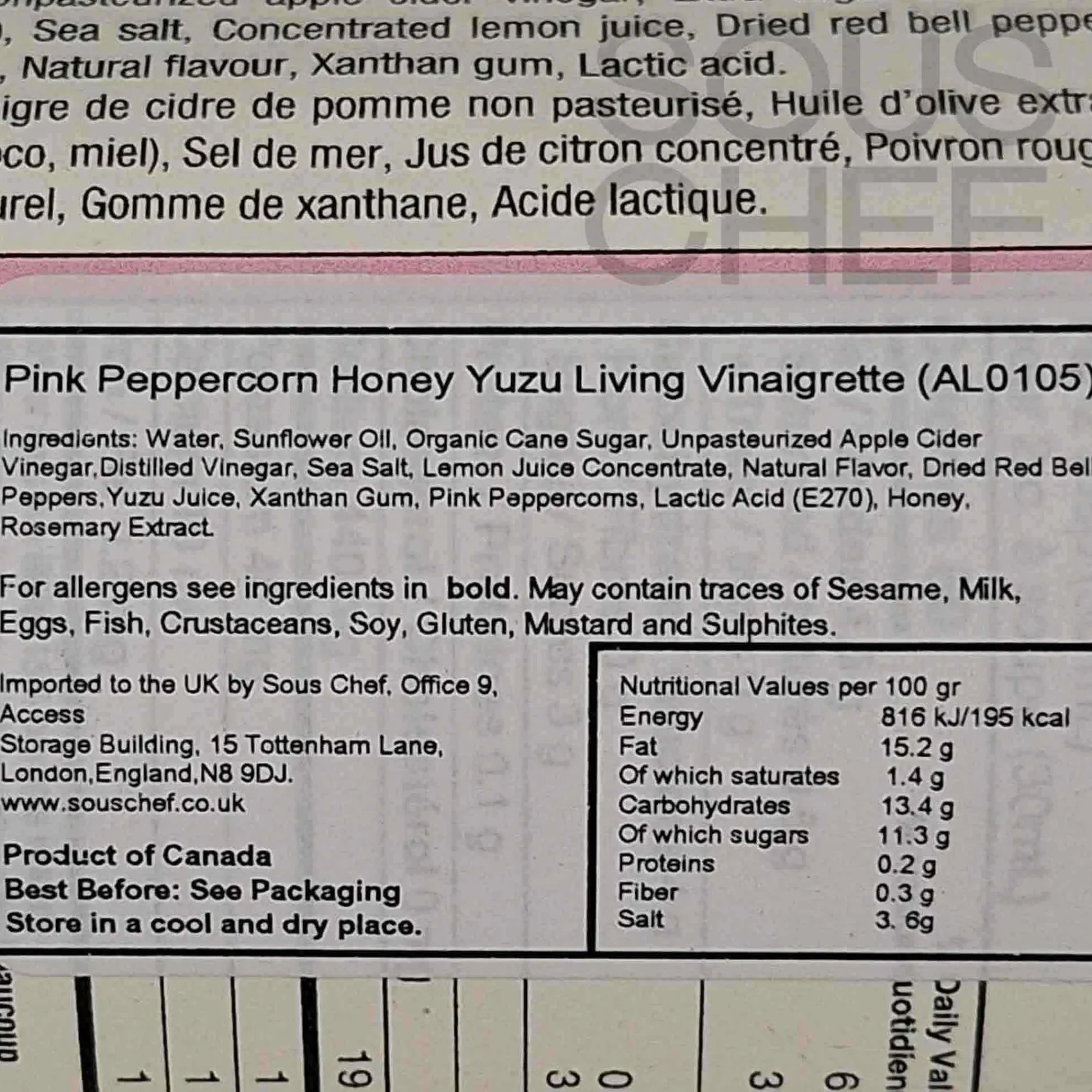 Product formulations and details may change. For the latest ingredients and allergen information always check product packaging prior to consumption. Ingredients: Water, mid oleic sunflower oil, sugars (organic cane sugar, honey), unpasteurized apple cider vinegar, vinegar, sea salt, concentrated lemon juice, natural flavour, dried red bell peppers, yuzu juice, xanthan gum, pink peppercorns, lactic acid, rosemary extract.