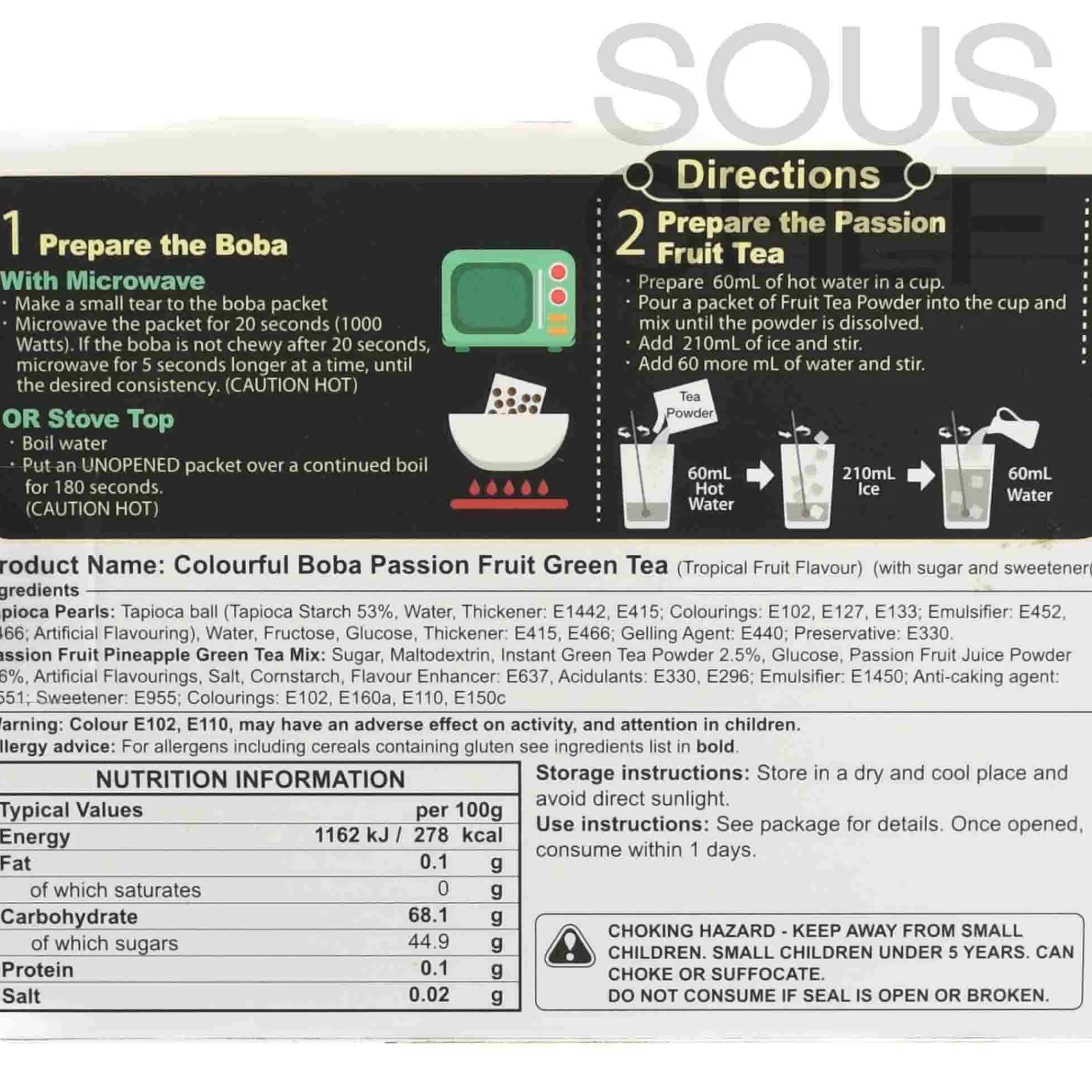 Product formulations and details may change. For the latest ingredients and allergen information always check product packaging prior to consumption. Ingredients: Tapioca pearls: tapioca ball (tapioca starch, water, thickeners (e1442, e415), colour (e150d), emulsifiers (e452, e466), artificial brown sugar flavouring, brown sugar), water, fructose, glucose, thickeners (e415, e466), gelling agent (e440), preservative (e330). passion fruit pineapple green tea mix: sugar, maltodextrin, instant green tea powder (3%), glucose, passion fruit juice powder,artificial flavourings, salt, cornstarch, flavour enhancer (e637), acidity regulators (e330, e296), emulsifier (e1450), anti-caking agent (e551), sweetener (e955), colours (e102, e160a, e110, e150c).