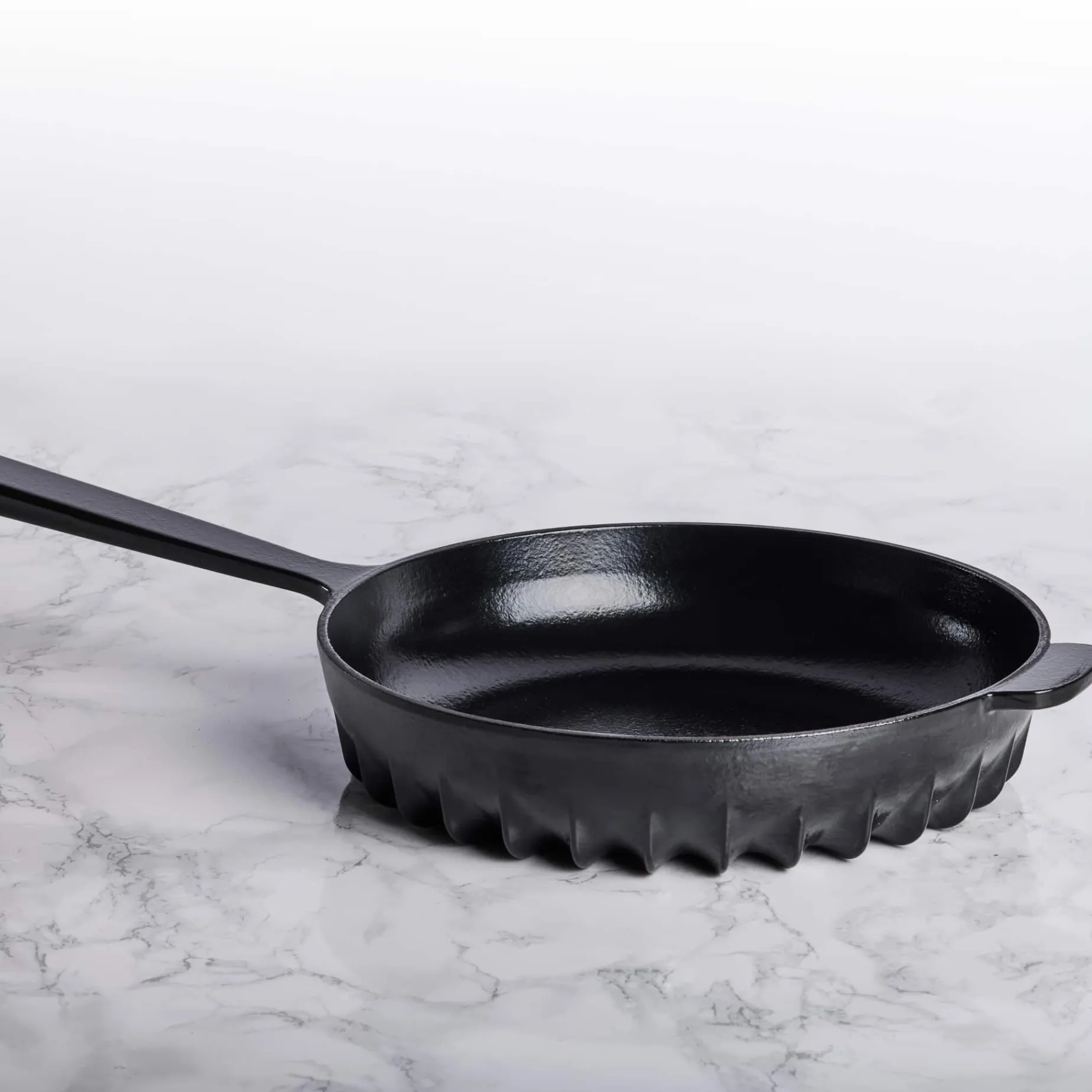 The FIREUP black frying pan is made from enamelled cast iron. The fin design guides heat across the base and up the sides of the skillet. This means the pan heats up faster and cooks more evenly.