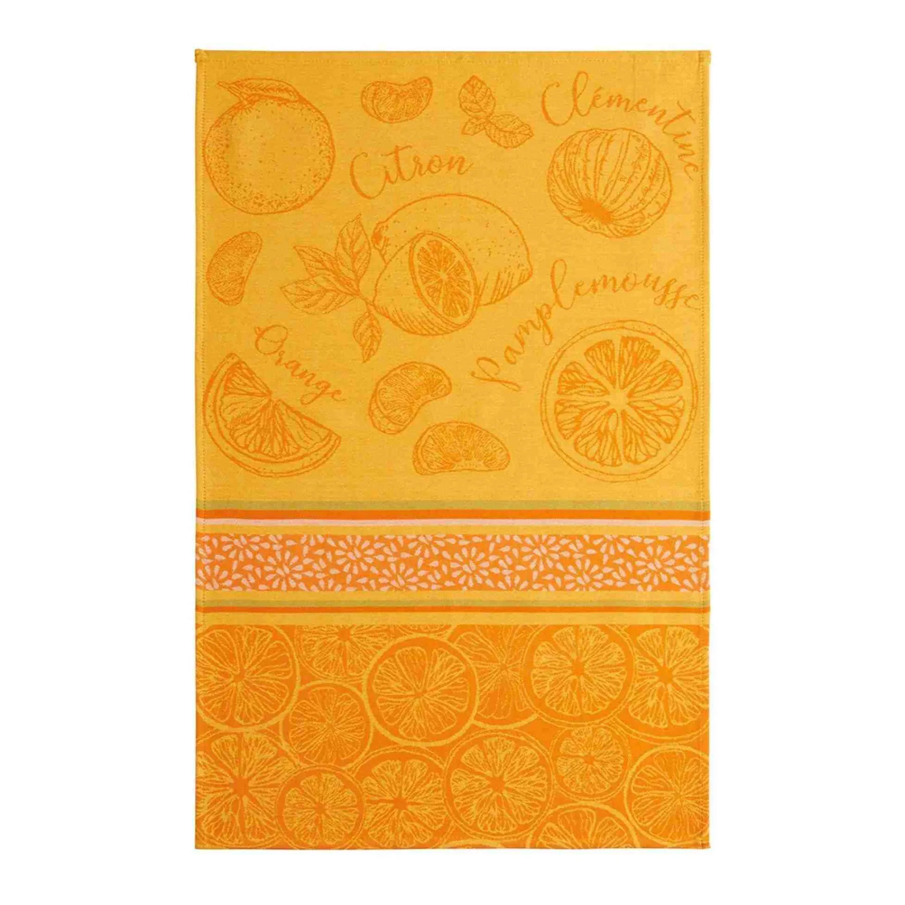This vibrant French tea towel brings a burst of colour to your kitchen with its bright orange and yellow design. Illustrated with citrus fruits and intricate patterns, this generously sized tea towel is 100% cotton.