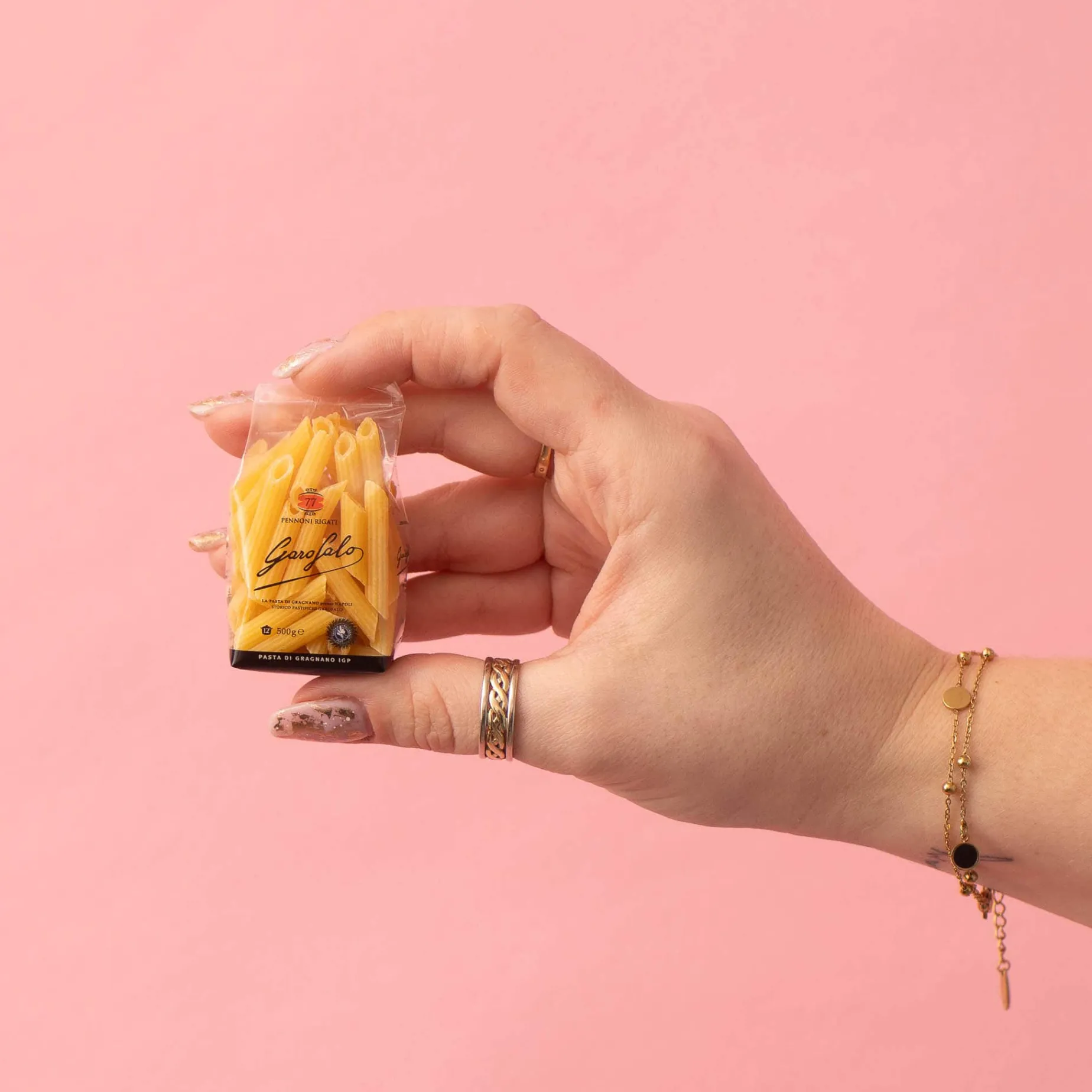 Inspired by Garofalo’s distinctive packaging, the magnet looks just like a bag of dried pennoni rigati. Larger than traditional penne, these large pasta tubes are perfect for making pennoni alla vodka. Displayed proudly on your fridge, this quirky magnet will delight any passing pasta connoisseur.