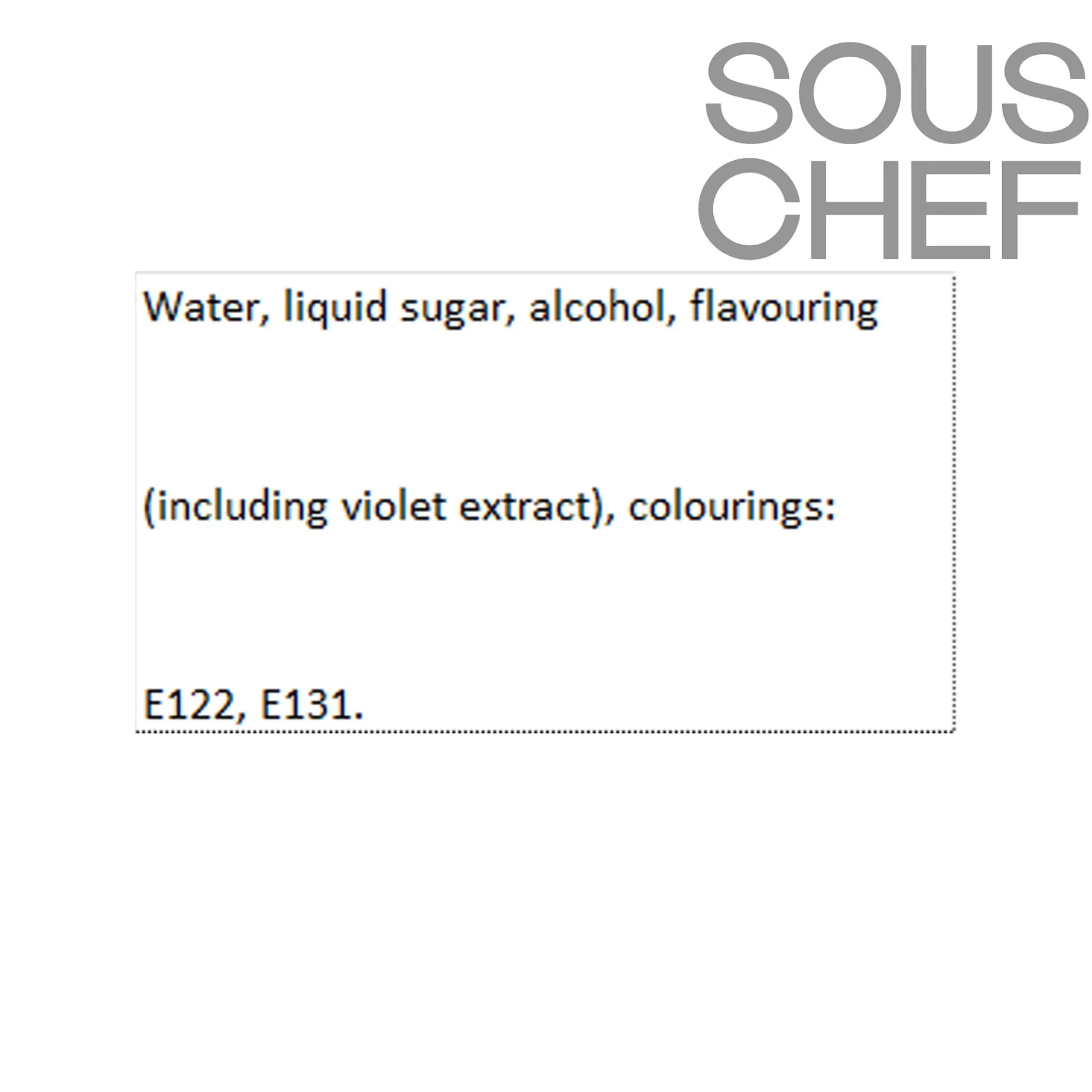 Product formulations and details may change. For the latest ingredients and allergen information always check product packaging prior to consumption. Ingredients: Water, liquid sugar, alcohol, flavouring (including violet extract), colourings: e122, e131.