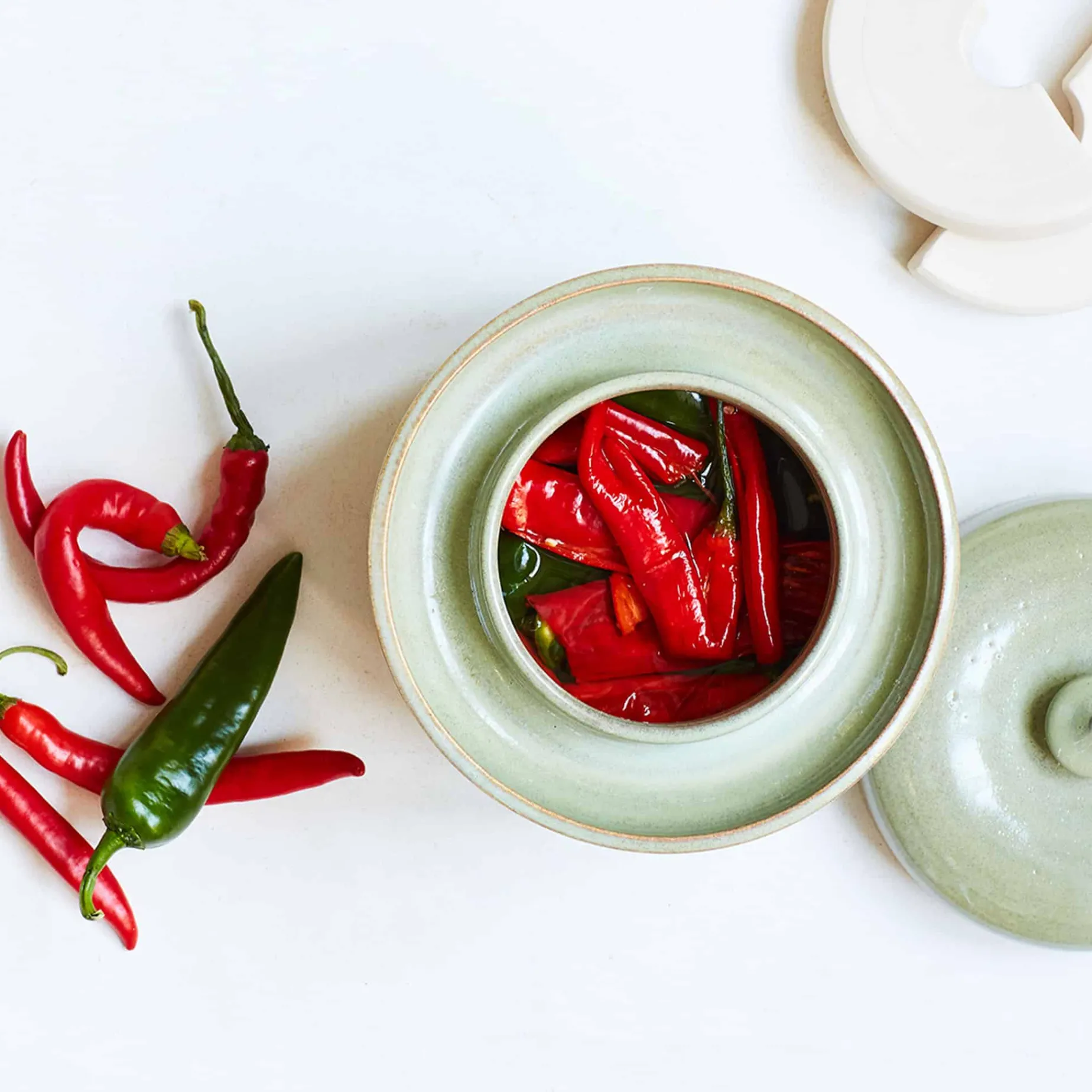 This handmade stoneware fermenting crock in green is a beautiful piece of kitchen equipment for those that love making sauerkraut, kimchi and pickles at home.