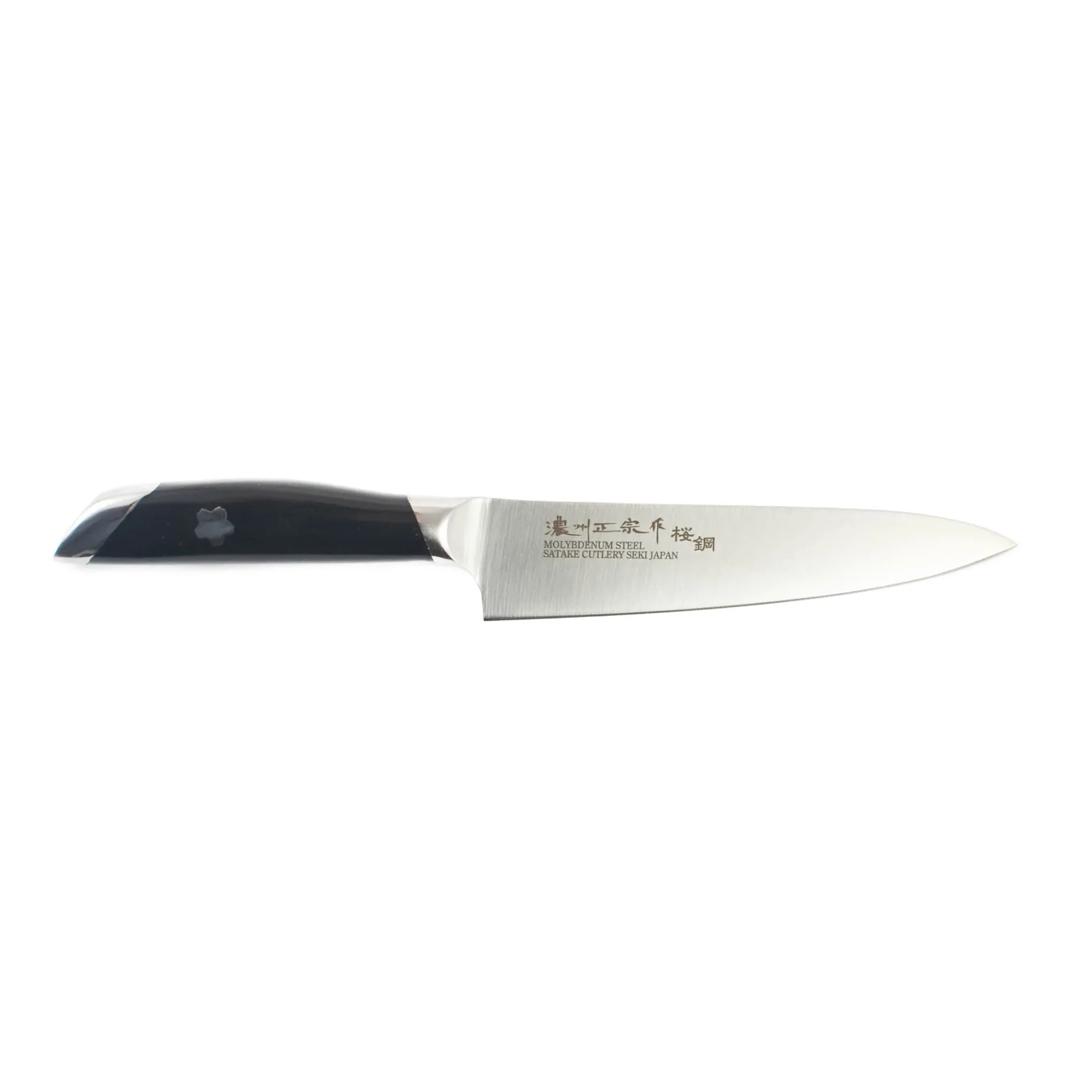This Japanese Seki Petty knife is smaller than a chef’s knife but larger than a paring knife. Its slim shape makes it ideal for handheld work, like removing eyes from potatoes. Perfect for peeling and trimming a variety of fruits, vegetables, herbs and proteins, you can even use it to carve artistic garnishes. The elegant black handle is curved for comfort. The blade is made from molybdenum Japanese steel, with a Rockwell scale of Härte HRC 55. This hard-working utility knife is easy to use and easy to sharpen. Made in Seki City, Japan: world-renowned for their knife production, with a tradition dating back almost 800 years.