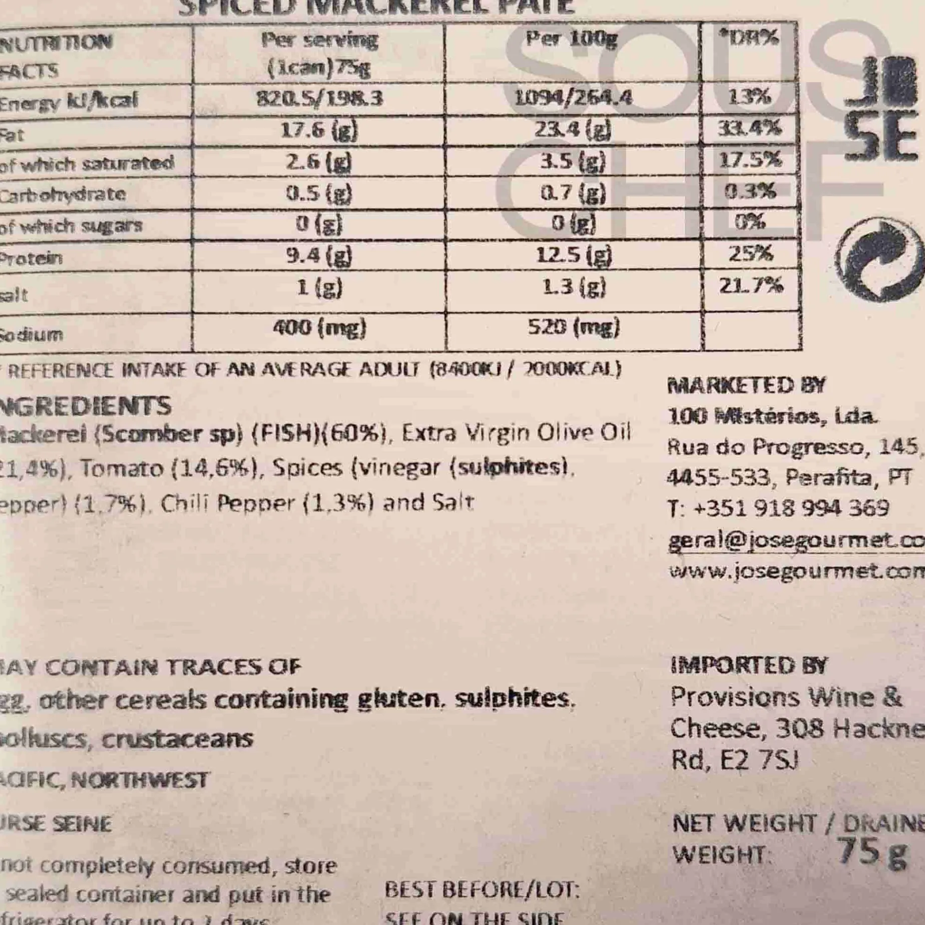 José Gourmet spiced mackerel pâté is a delightful seafood snack. It’s made with sustainably caught mackerel and Portuguese olive oil. Serve it on crackers, oatcakes and grilled crostini.