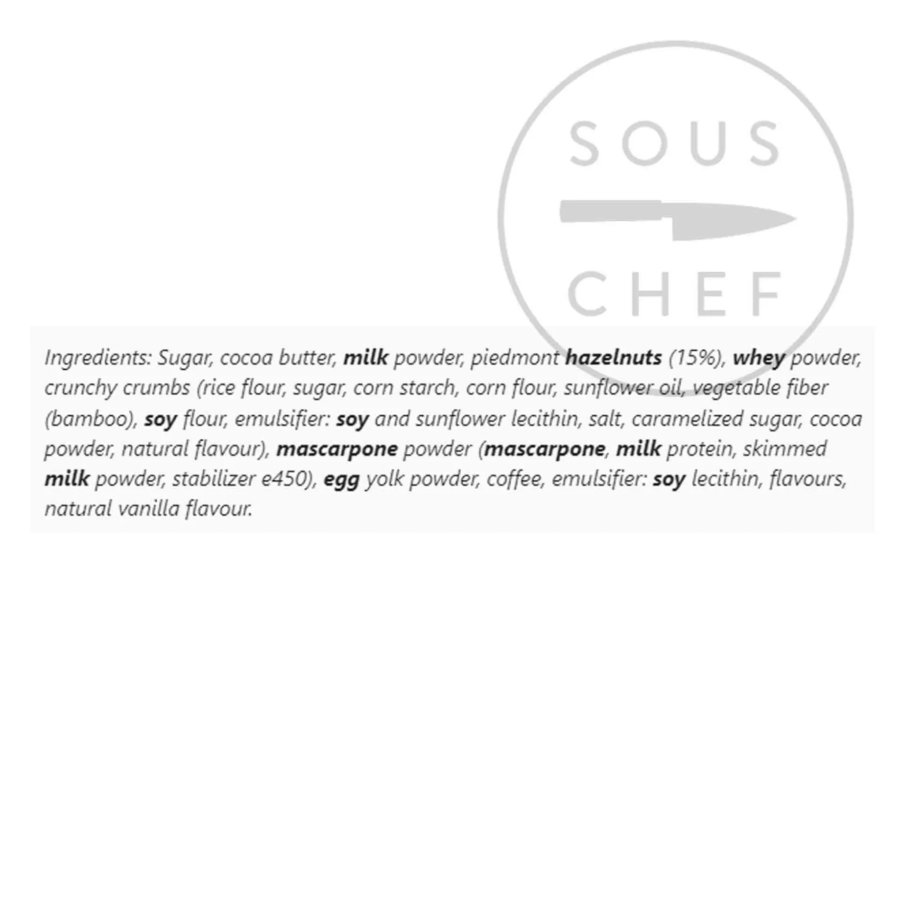 Product formulations and details may change. For the latest ingredients and allergen information always check product packaging prior to consumption. Ingredients: Sugar, cocoa butter, milk powder, piedmont hazelnuts (15%), whey powder, crunchy crumbs (rice flour, sugar, corn starch, corn flour, sunflower oil, vegetable fiber (bamboo), soy flour, emulsifier: soy and sunflower lecithin, salt, caramelized sugar, cocoa powder, natural flavour), mascarpone powder (mascarpone, milk protein, skimmed milk powder, stabilizer e450), egg yolk powder, coffee, emulsifier: soy lecithin, flavours, natural vanilla flavour.
