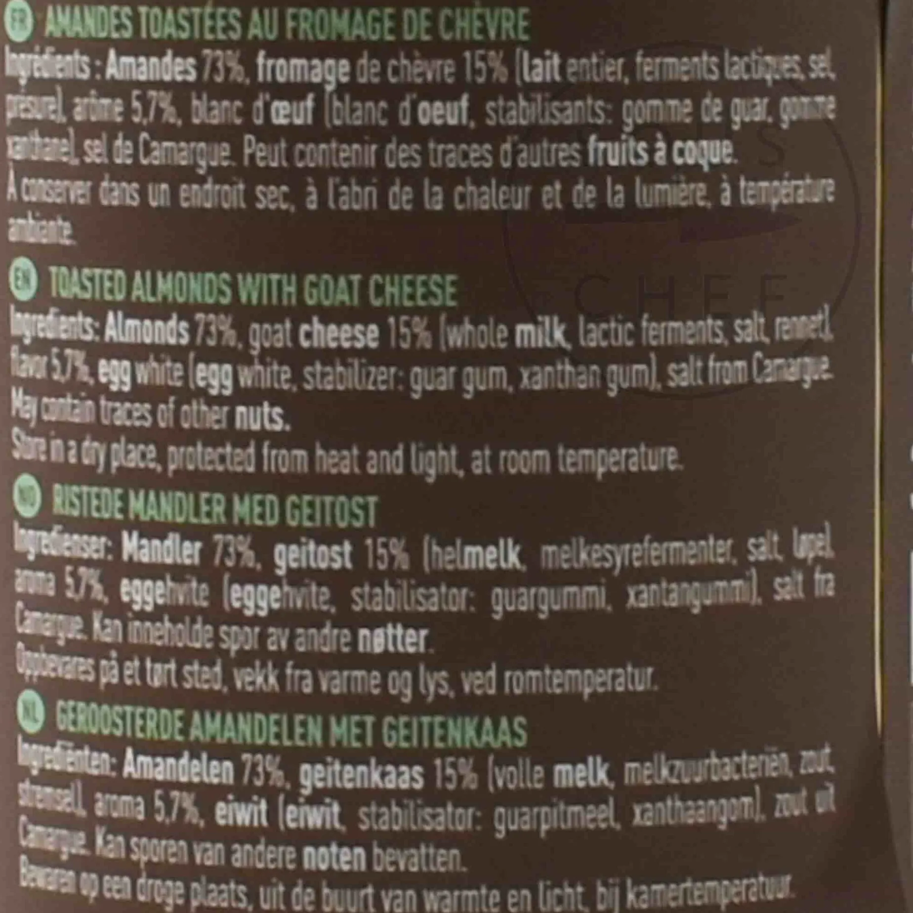 Product formulations and details may change. For the latest ingredients and allergen information always check product packaging prior to consumption. Ingredients: Almonds 73%, goat cheese 15% (whole milk, lactic ferments, salt, rennet), aroma 5.7%, egg white (egg white, stabilisers: guar gum, xanthan gum), camargue salt.