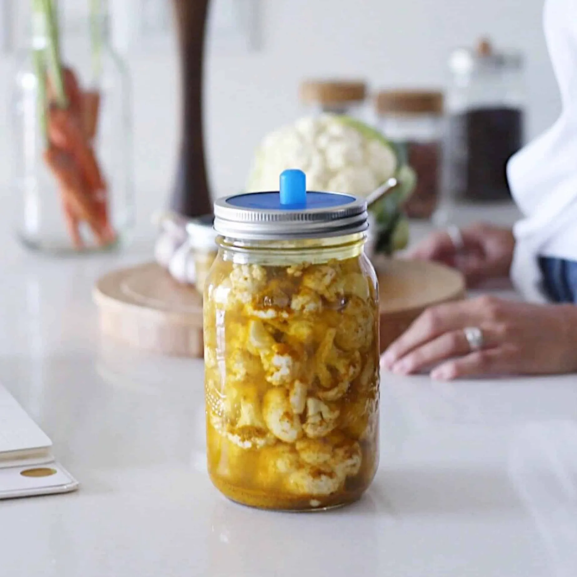 With Masontops wide mouth pickle pipes, there’s no need to manually burp your pickles. The pickle pipes are silicone airlocks, designed specifically for Mason jars. They feature a one-way valve that automatically releases gas, without letting in any oxygen that can cause spoilage. This means you don’t need to babysit your pickles or manually burp them.