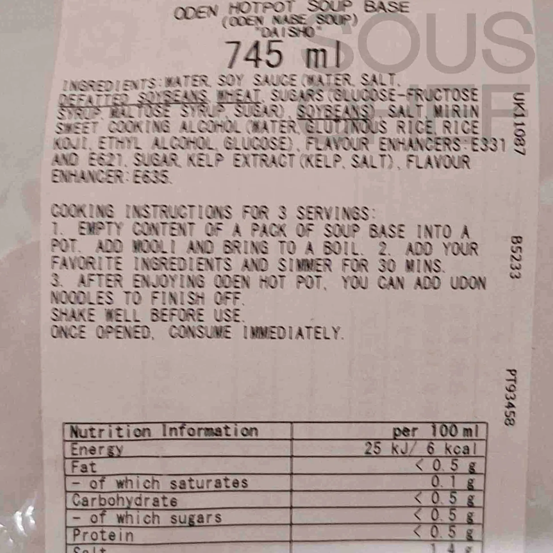 Product formulations and details may change. For the latest ingredients and allergen information always check product packaging prior to consumption. Ingredients: water, soy sauce (water, salt, defatted soybeans, wheat, sugars (glucose-fructose syrup, maltose syrup, sugar), soybeans), salt, mirin sweet cooking alcohol (water, glutinous rice, rice koji, ethyl alcohol , glucose), flavour enhancers: e331 and e621, sugar, kelp extract (kelp, salt), flavour enhancer: e635.