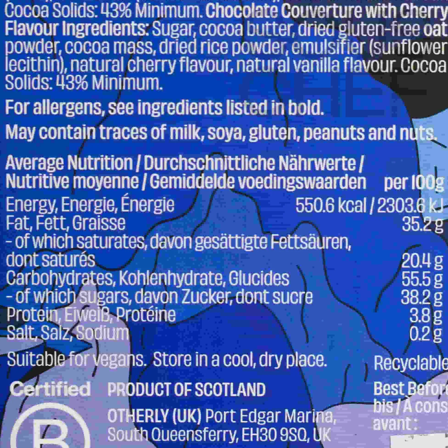 Product formulations and details may change. For the latest ingredients and allergen information always check product packaging prior to consumption. Ingredients: Plain Oatm*lk: Sugar, cocoa butter, dried gluten-free oat powder, cocoa mass, dried rice powder, emulsifier (sunflower lecithin), natural vanilla flavour. Sea Salt: Sugar, cocoa butter, dried gluten-free oat powder, cocoa mass, dried rice powder, sea salt, emulsifier (sunflower lecithin), natural vanilla flavour. Salted Caramel: Sugar, cocoa butter, dried gluten-free oat powder, cocoa mass, dried rice powder, sea salt, emulsifier (sunflower lecithin), natural flavours (caramel, vanilla). Cold Brew Coffee: Sugar, cocoa butter, dried gluten-free oat powder, cocoa mass, dried rice powder, coffee, emulsifier (sunflower lecithin), natural vanilla flavour. Cherry: Sugar, cocoa butter, dried gluten-free oat powder, cocoa mass, dried rice powder, emulsifier (sunflower lecithin), sea salt (<1%), natural caramel flavour, natural cherry flavour, natural vanilla flavour.