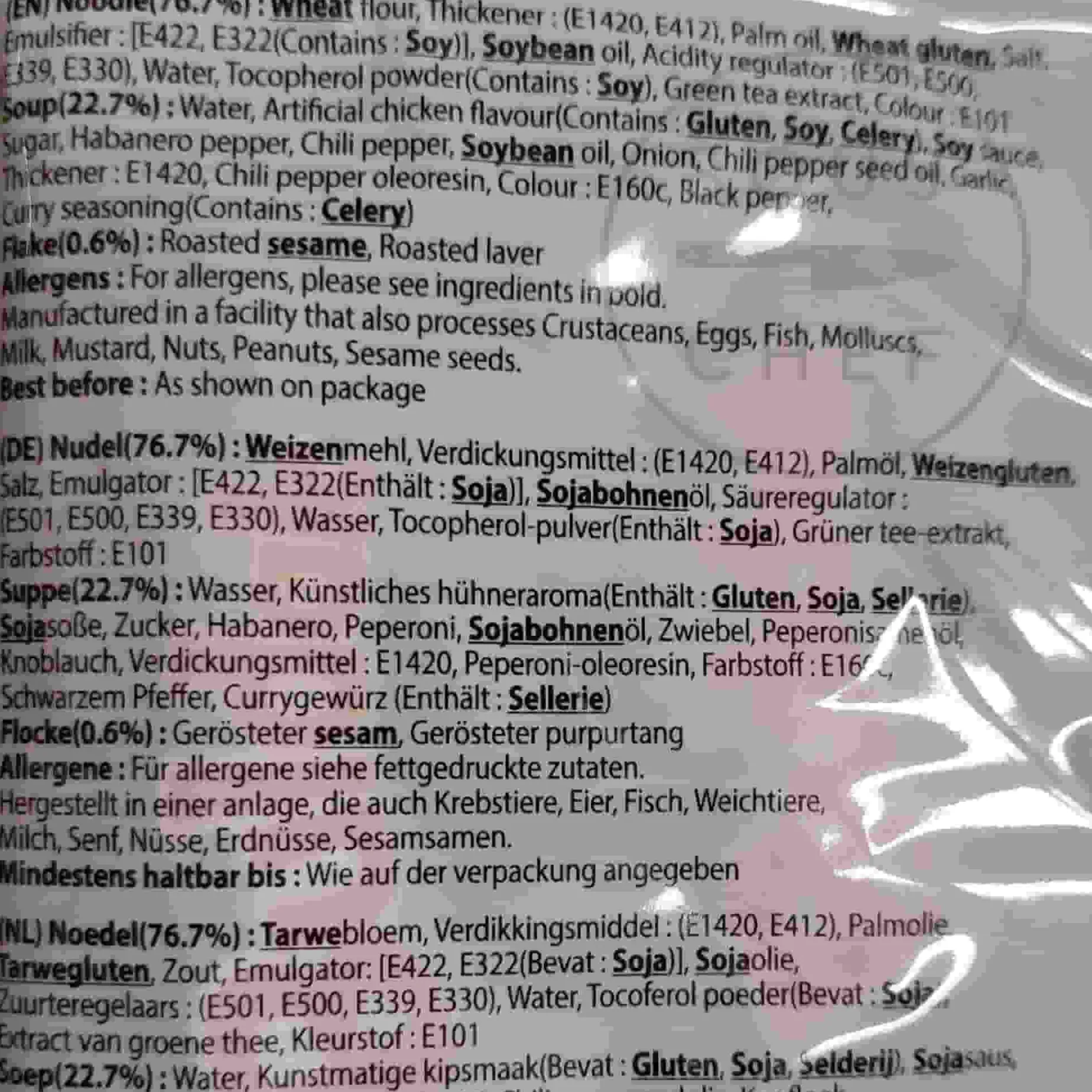 Product formulations and details may change. For the latest ingredients and allergen information always check product packaging prior to consumption. Ingredients: Noodles (76.7%): wheat flour, thickener (E1420, E412), palm oil, wheat gluten, salt, emulsifier (E422, soy lecithin (E322)), acidity regulator (potassium carbonate (E501), sodium carbonate (E500), sodium phosphate dibasic (E339), citric acid (E330)), water, tocopherol powder (contains soy), green tea extract, colour E101. Soup (22.7%): water, artificial chicken flavour (Contains: gluten, soy, celery), soy sauce, sugar, habanero pepper, chilli pepper, soybean oil, onion, chilli pepper seed oil, garlic, thickener: E1420, chilli pepper oleoresin, colour E160c, black pepper, curry seasoning (contains celery). Flake (0.6%): roasted sesame, roasted laver.