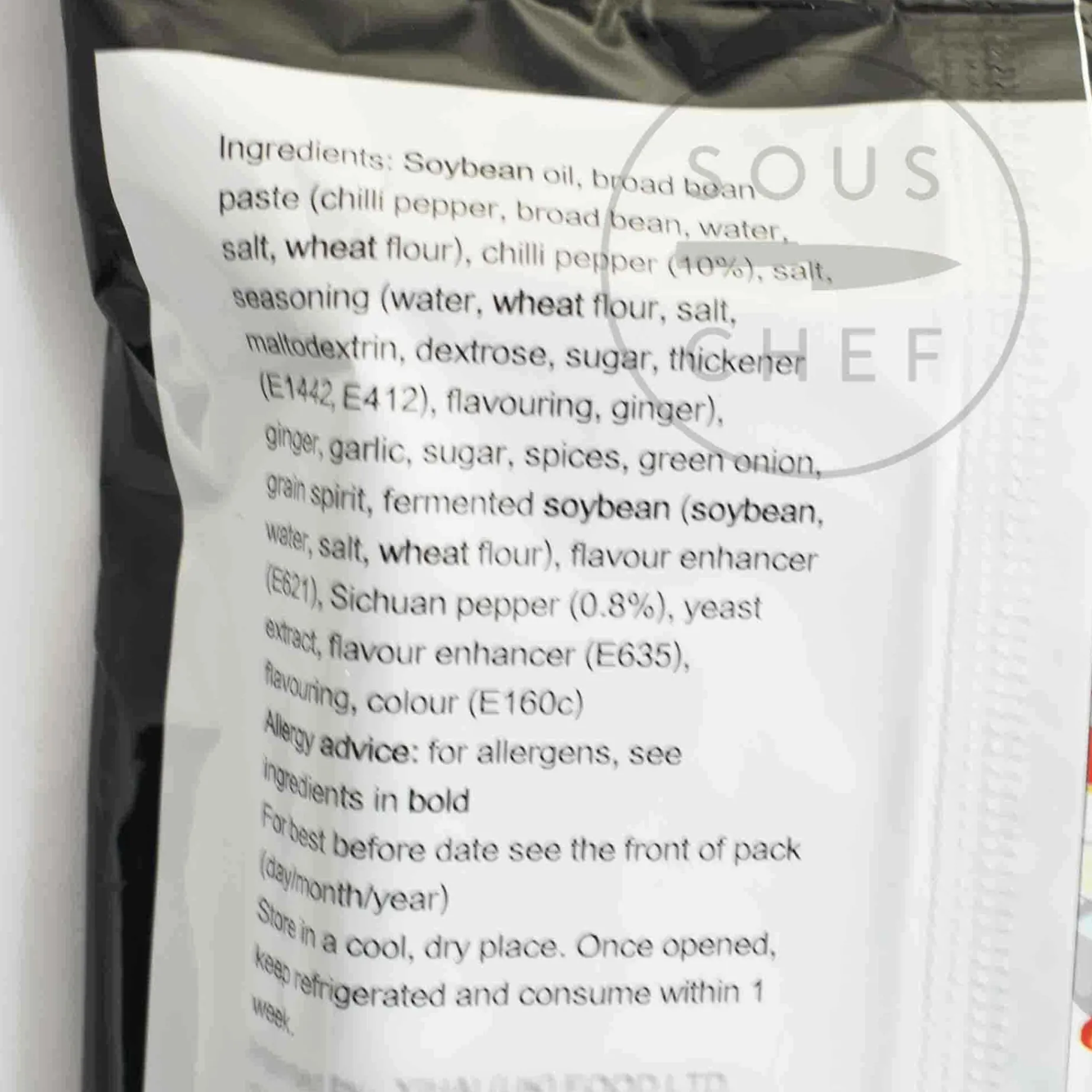 Product formulations and details may change. For the latest ingredients and allergen information always check product packaging prior to consumption. Ingredients: Soybean oil (from gm soybeans) , salt, chili(6%), broad bean paste [chili, broad bean, salt, wheat flour (gluten)], prickly ash (2.5%), spices (pepper, cardamom, nutmeg, fennel, anise, cinnamon, clove, orange peel, liquorice), liquor, ginger, garlic, sugar (sulphite), onion, fermented soybean [soybean, water, salt], yeast extract, prickly ash extract, flavour enhancer (e635)