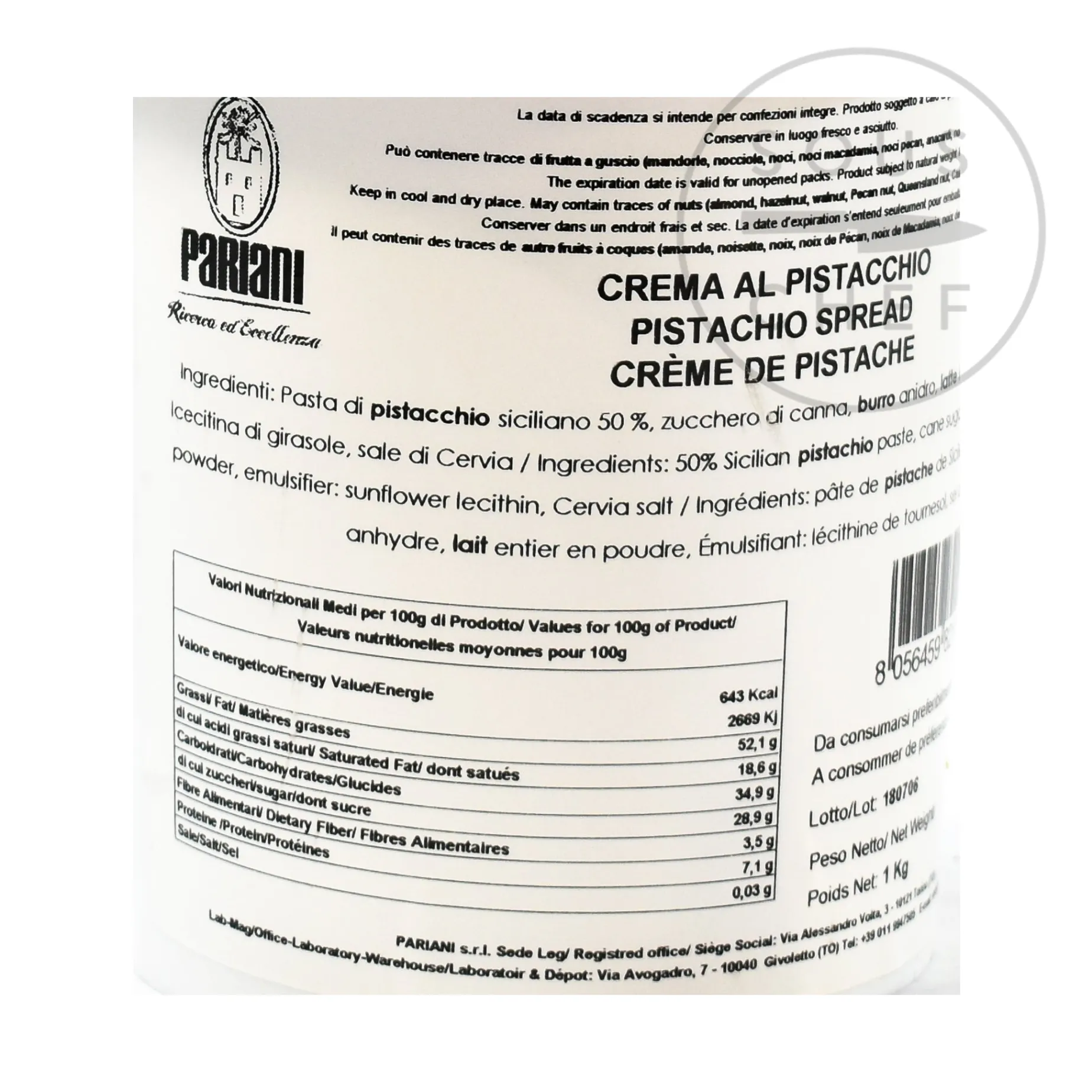 Product formulations and details may change. For the latest ingredients and allergen information always check product packaging prior to consumption. Ingredients: Sicilian pistachio paste (50%), cane sugar, concentrated butter, whole milk powder, Cervia salt. Contains allergens: nuts, milk.