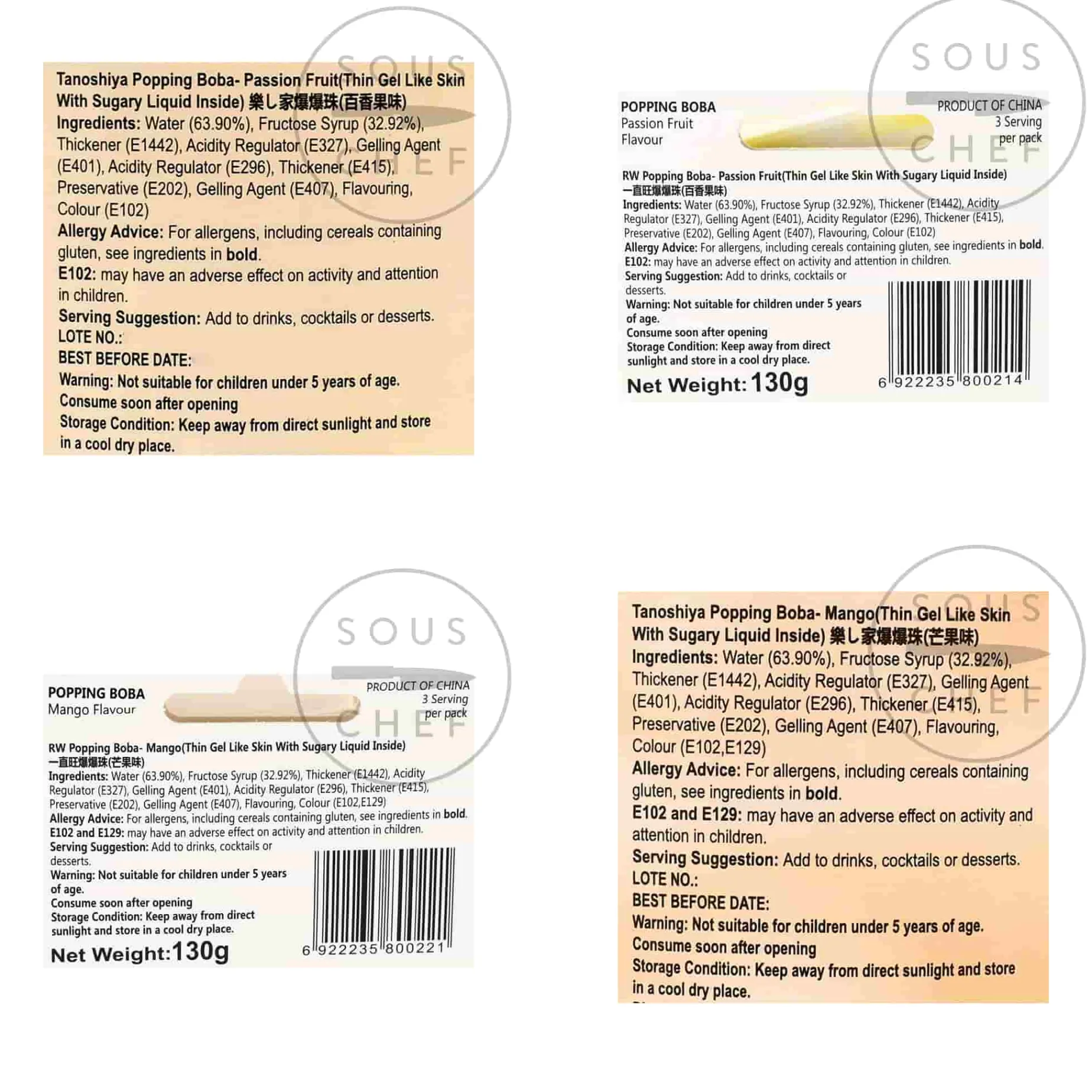 Tanoshiya’s popping boba come in two sizes and the following flavours: