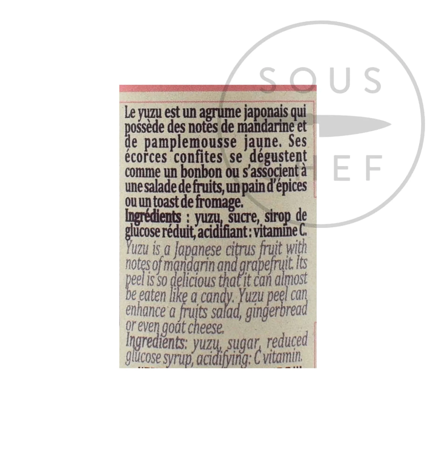 Product formulations and details may change. For the latest ingredients and allergen information always check product packaging prior to consumption. Ingredients: Yuzu, sugar, reduced glucose syrup, acidifying: vitamin C