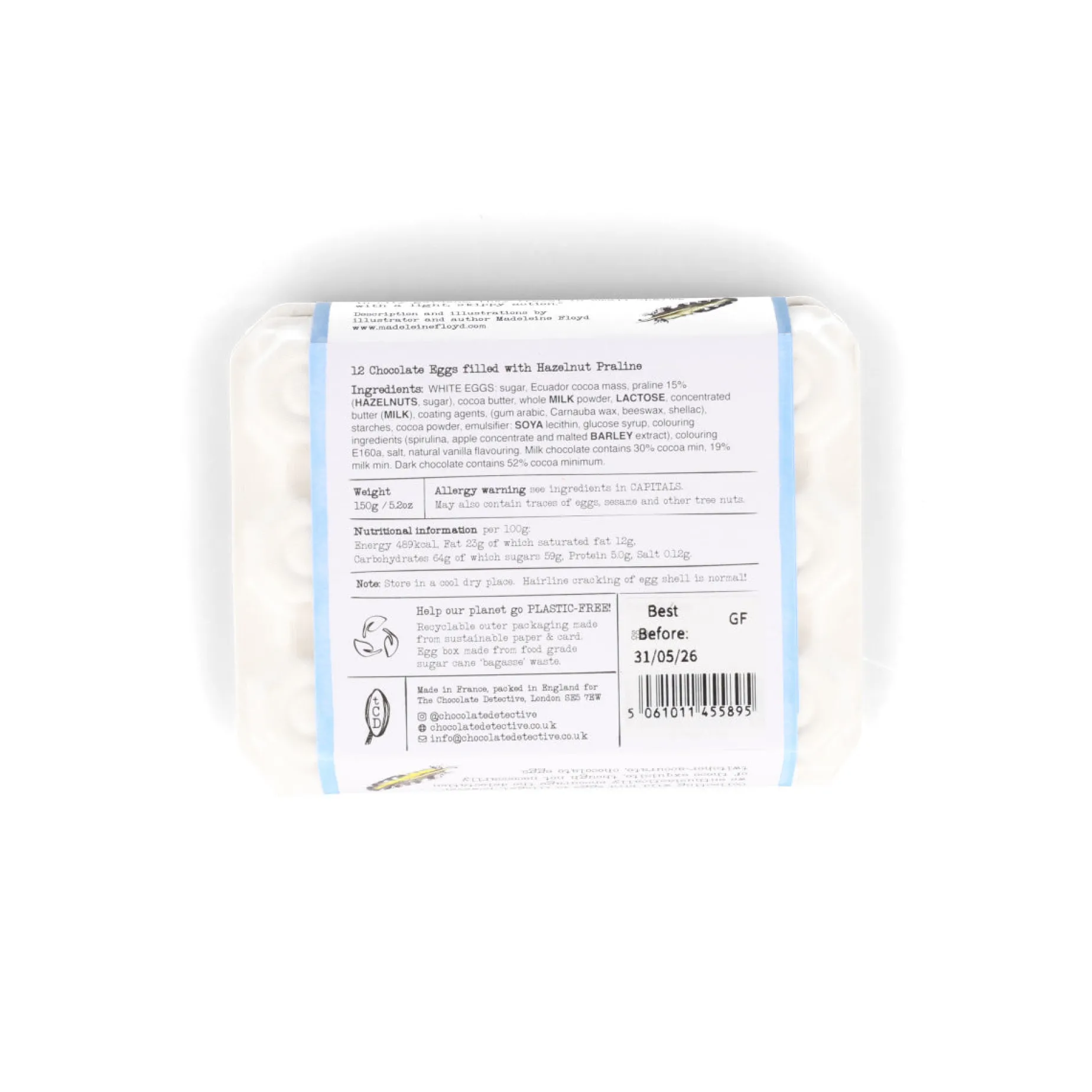 The eggs are made in France using bean-to-bar couverture. The ethically produced cocoa comes from a large farm in Ecuador.