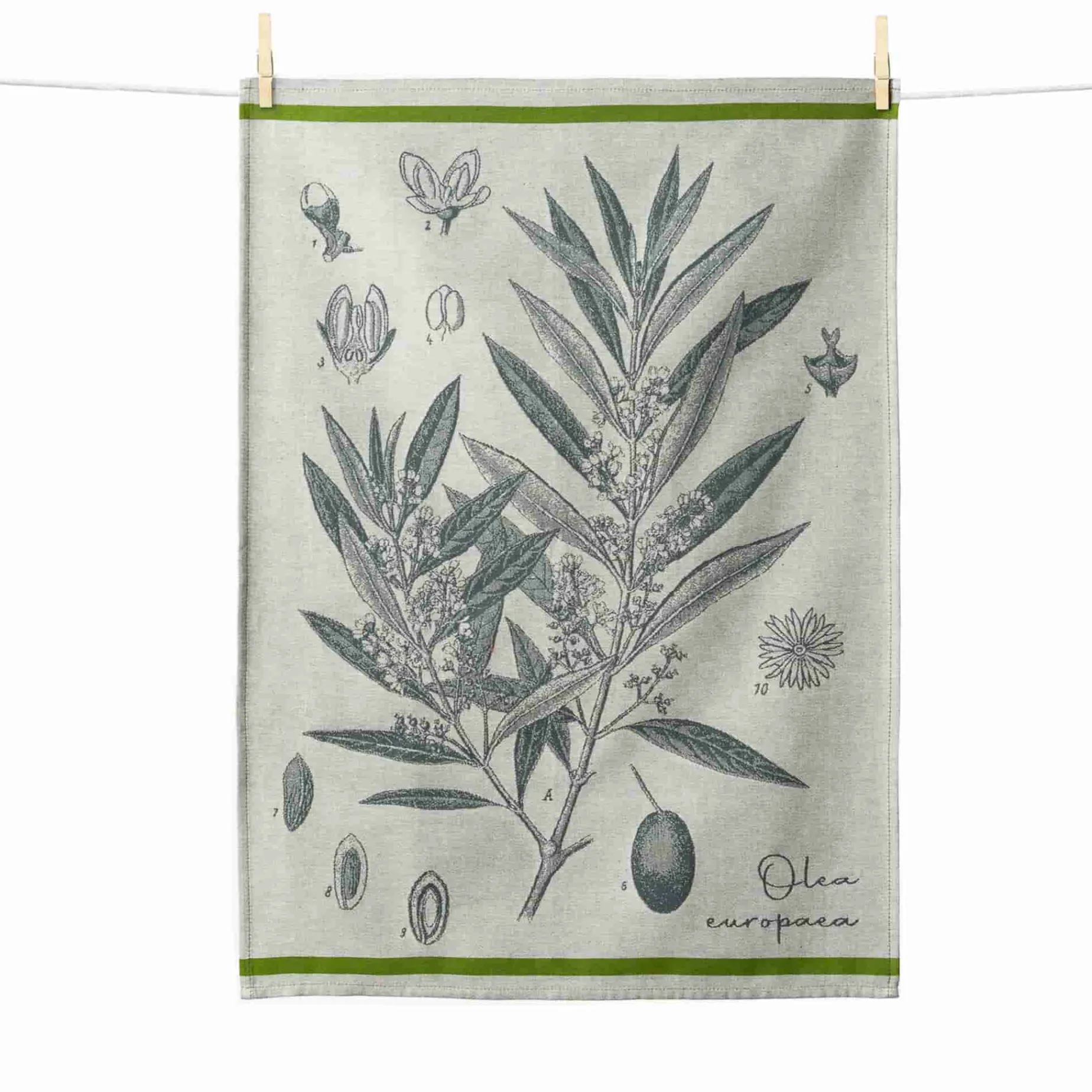 This Jacquard tea towel adds Mediterranean flair to your kitchen. Made from 100% cotton, it features an olive design on a grey background. Dark green stripes add a pop of colour to the top and bottom of the towel.