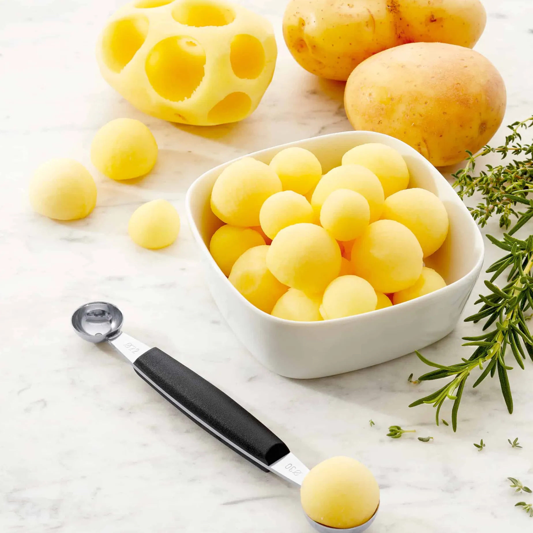 Melon ballers are also known as Parisienne scoops. You can use them to make small, round potatoes known as pommes Parisienne. They’re baked in butter until they are crisp and golden. Serve them with steak or fish as an alternative to fries or mash.
