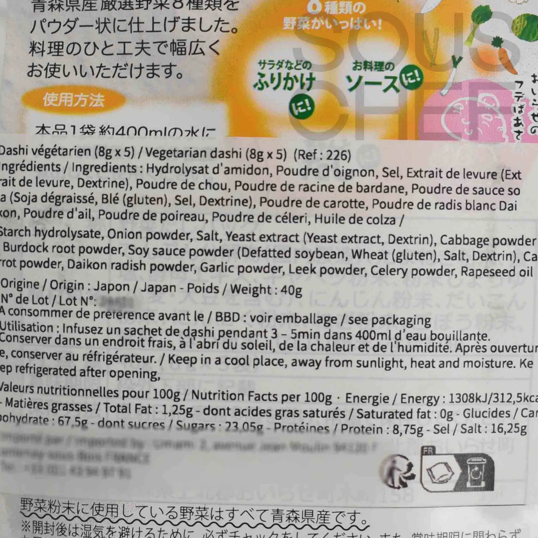 Product formulations and details may change. For the latest ingredients and allergen information always check product packaging prior to consumption. Ingredients: Starch hydrolysate (35,167%), onion powder (20%), salt (14%), yeast extract (yeast extract, dextrin) (7,3%), cabbage powder (5%), burdock root powder (5%), soy sauce powder (defatted soybean, wheat, salt, dextrin) (3%), carrot powder (2,5%), daikon radish powder (2,5%), garlic powder (2,5%), leek powder (2,5%), celery powder (0,33%), rapeseed oil (0,2%)