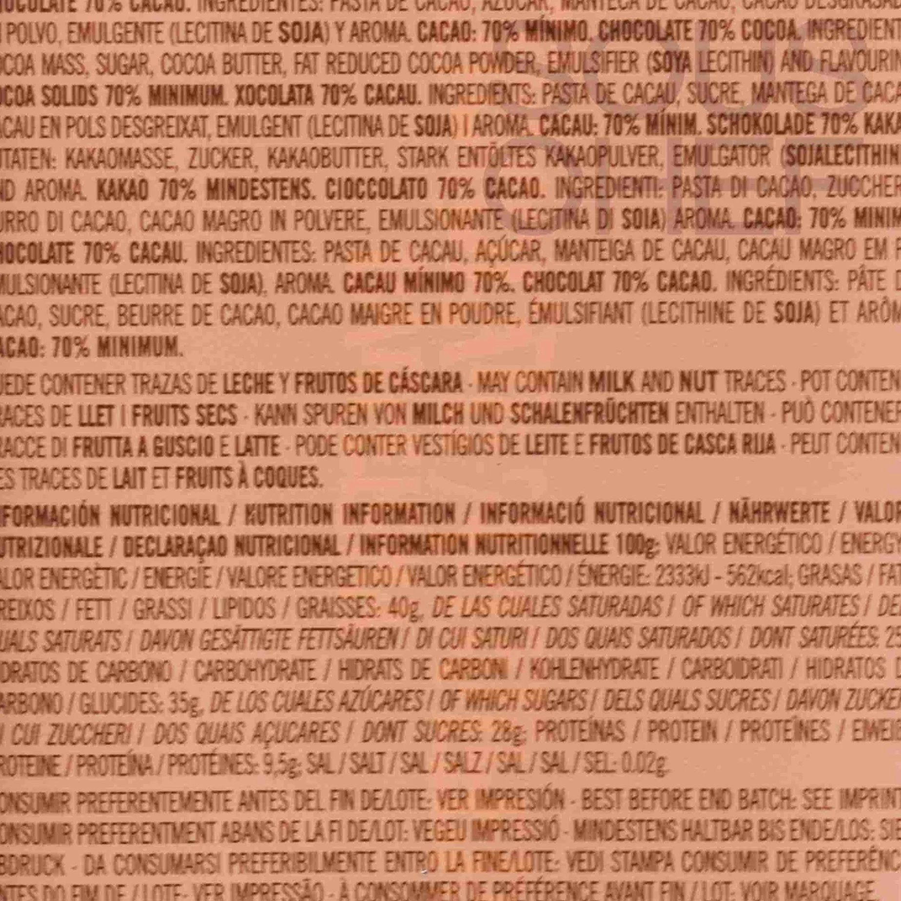 Product formulations and details may change. For the latest ingredients and allergen information always check product packaging prior to consumption. Ingredients: Cocoa mass, sugar, cocoa butter, fat reduced cocoa powder, emulsifier (soya lecthin) & flavouring. cocoa solids 70% minimum