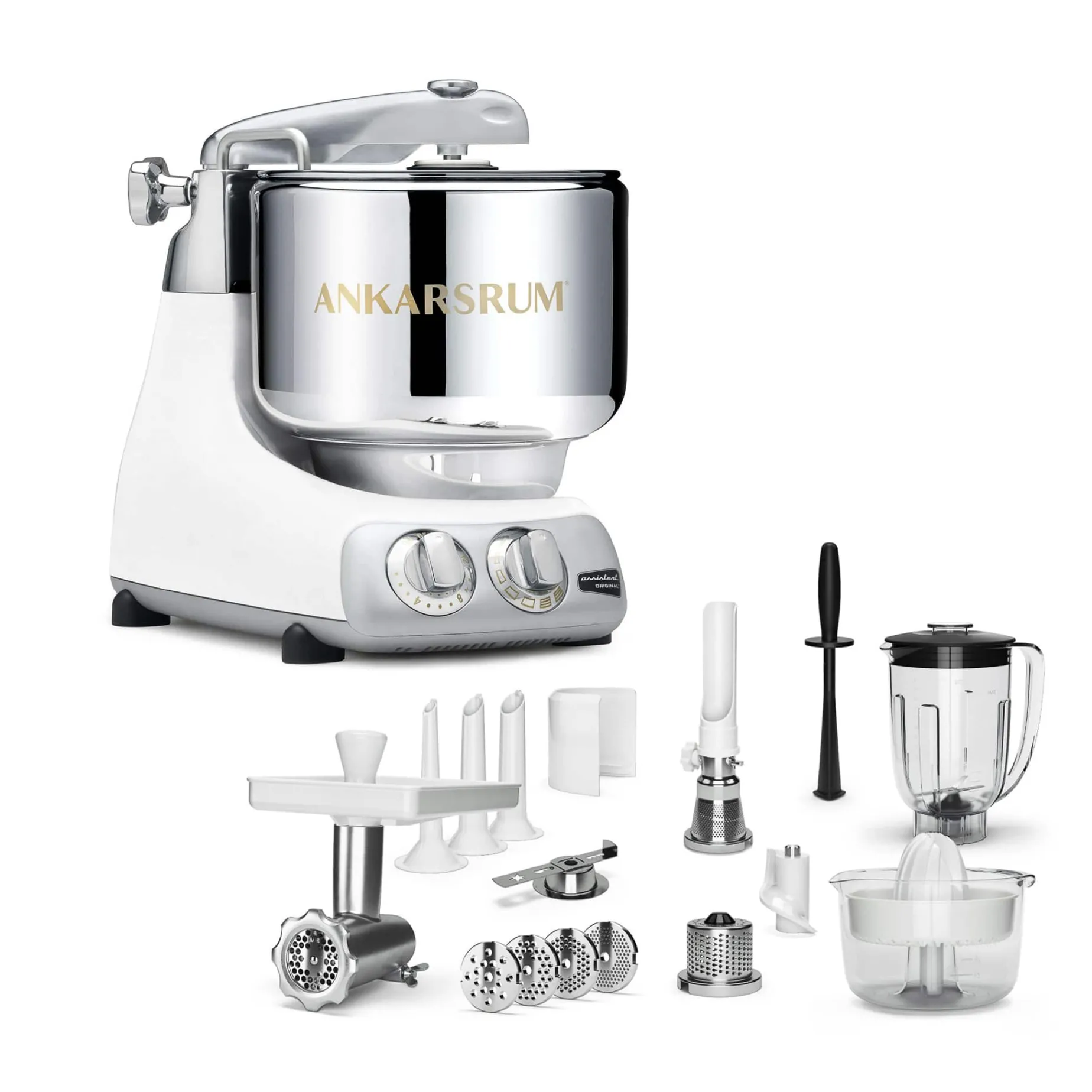 - Ankarsrum Assistent Original Stand Mixer with the standard mixer attachments & accessories