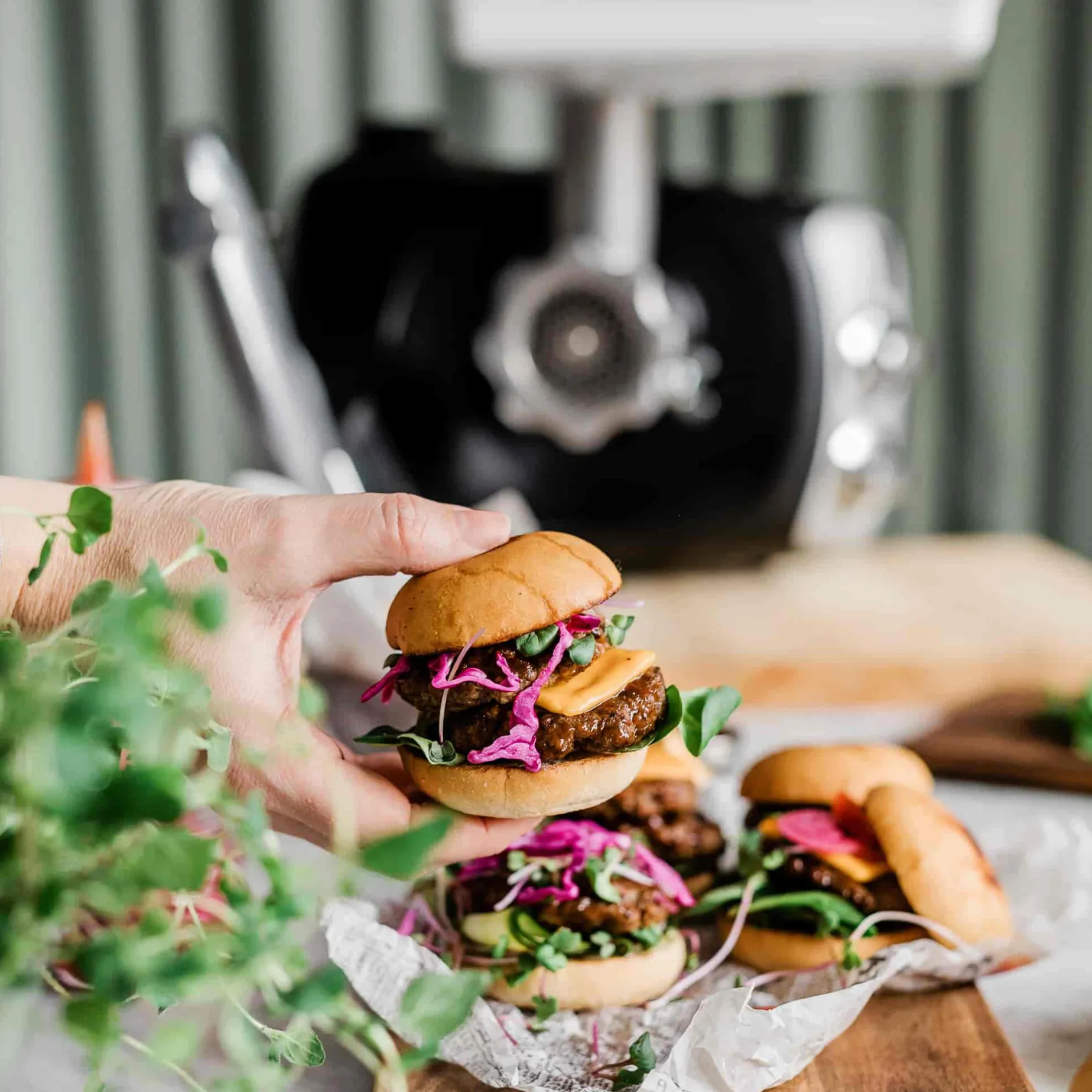 The mincer has coarse and fine discs for making burgers, meatballs and fishcakes. You can even have a go at making your own sausages!