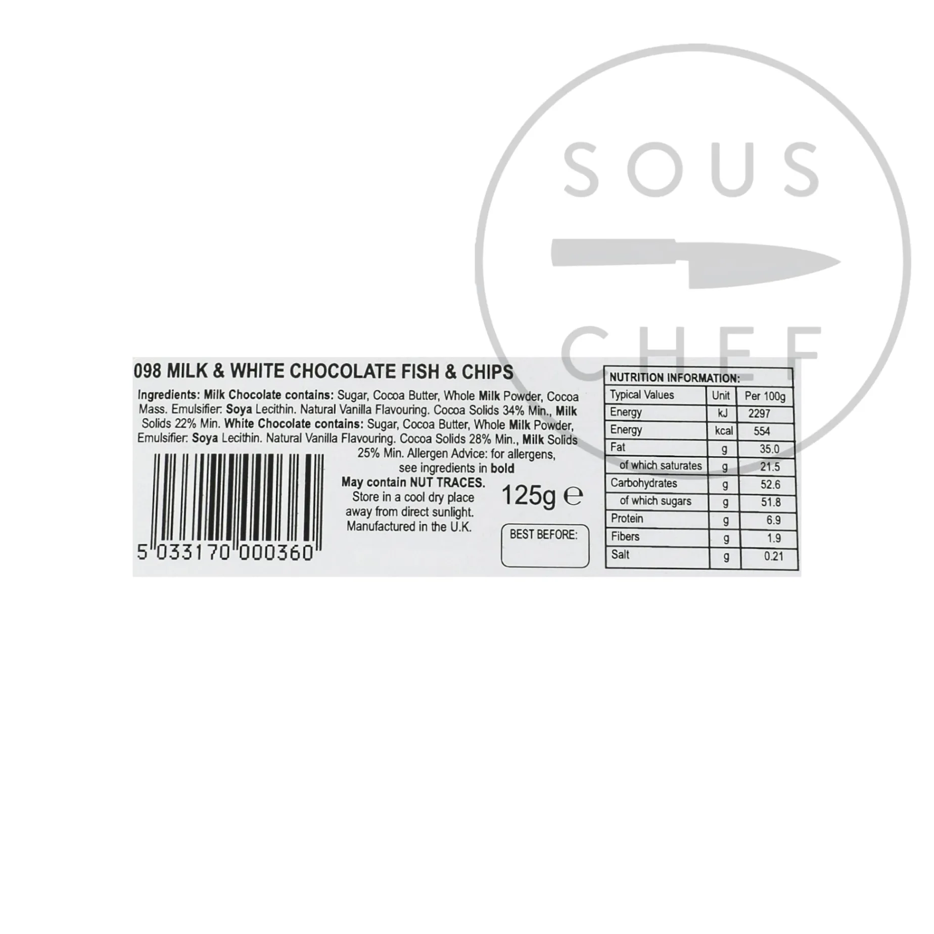 Product formulations and details may change. For the latest ingredients and allergen information always check product packaging prior to consumption. Ingredients: Milk Chocolate contains: Sugar, Cocoa Butter, Whole Milk POwder, Cocoa Mass. Emulsifier: Soya Lecithin. Natural Vanilla Flavouring. Cocoa Solids 34% Min., Milk Solids 22% Min. White Chocolate contains: Sugar, Cocoa Butter, Whole Milk Powder. Emulsifier: Soya Lecithin. Natural Vanilla Flavouring. Cocoa Solids 28% Min:; Milk Solids 25% Min.
