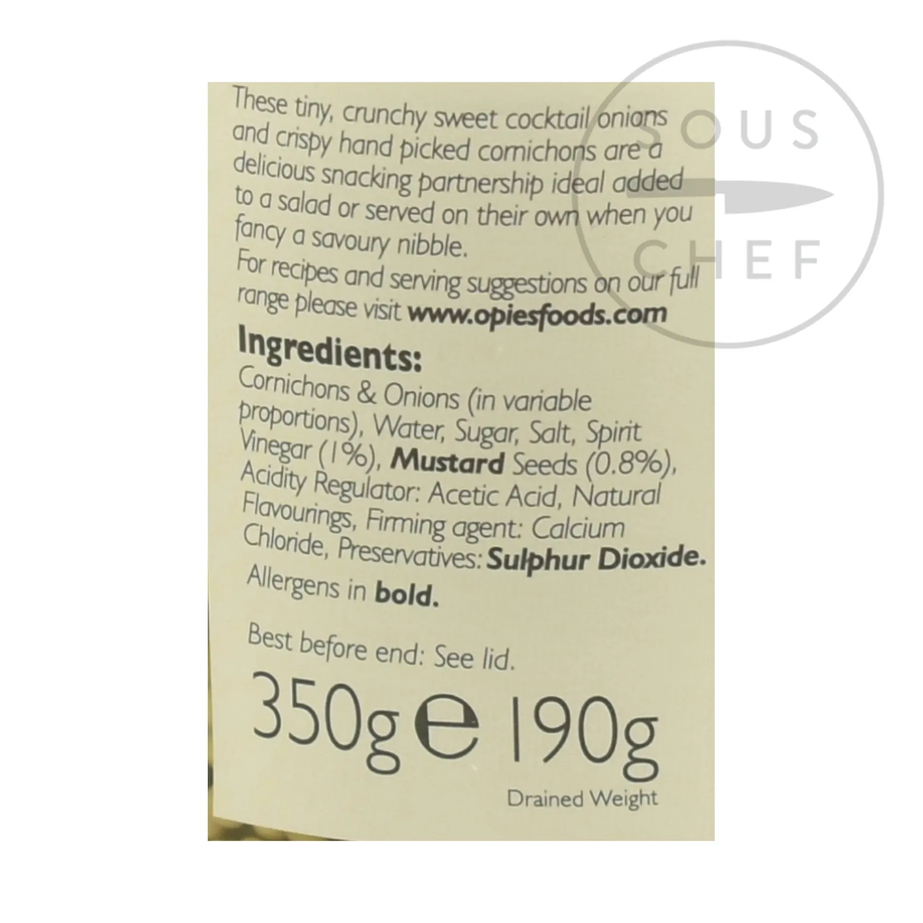 Product formulations and details may change. For the latest ingredients and allergen information always check product packaging prior to consumption. Ingredients: cornichons & onions (in variable proportions), water, sugar, salt, spirit vinegar (1%), mustard seeds (0.8%), acidity regulator: acetic acid, natural flavourings, firming agent: calcium chloride, preservatives: sulphur dioxide. Allergens are listed in bold.