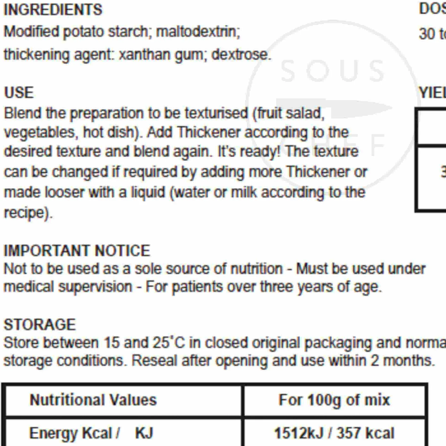 Essential Cuisine nutrisis thickener turns chunky textures into smooth sauces. Nutrisis thickener is designed to adapt the texture of meals for those that have difficulty swallowing or chewing. Simply add this thickener to your ingredients and blend, adding more powder until you reach the desired consistency. If you want the mixture a little looser, add milk or water and blend again.