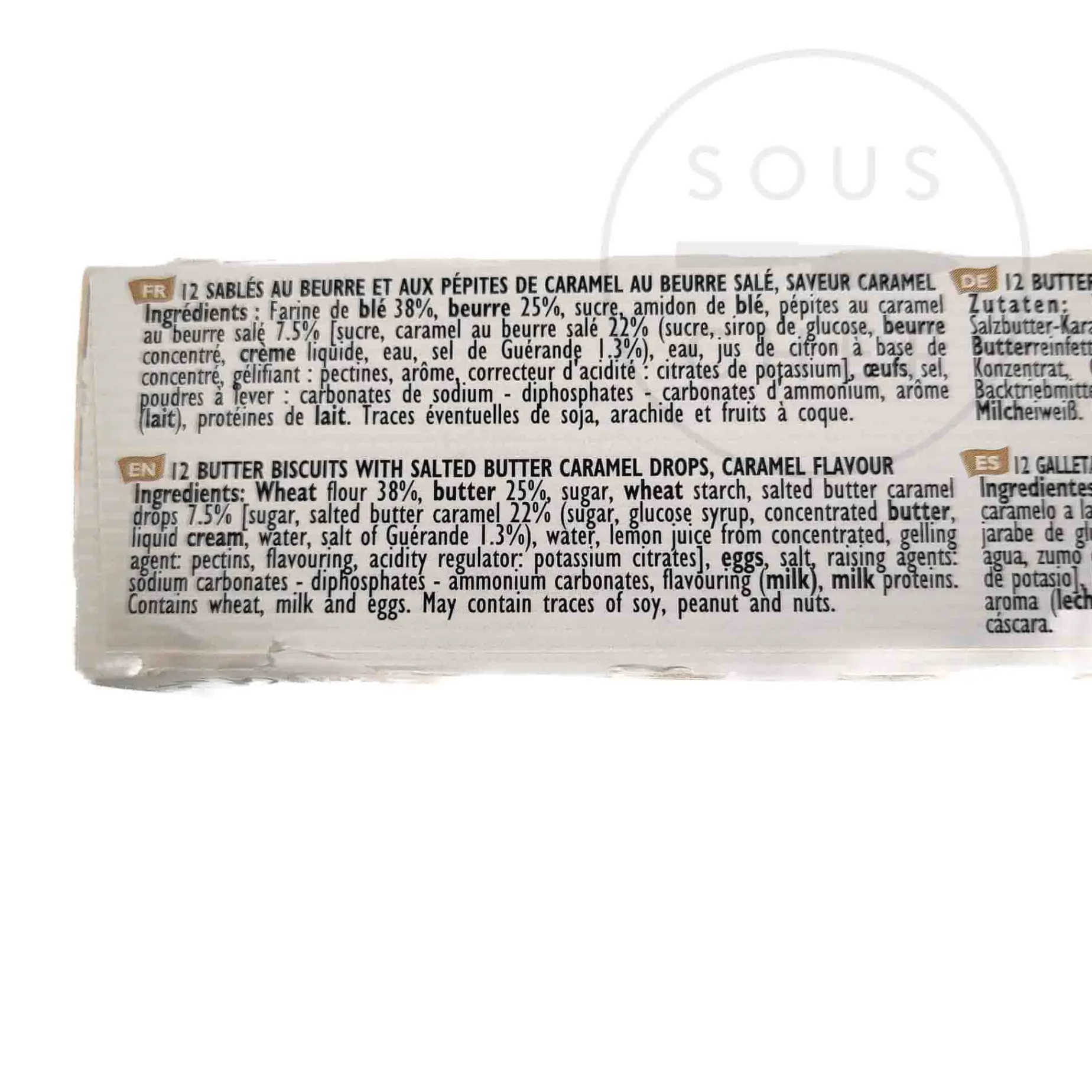 Product formulations and details may change. For the latest ingredients and allergen information always check product packaging prior to consumption. Ingredients: Wheat flour 38%, butter 25%, sugar, wheat starch, salted butter caramel drops 7.5% [sugar, salted butter caramel 22% (sugar, glucose syrup, concentrated butter, liquid cream, water, salt of guérande 1.3%), water, lemon juice from concentrated, gelling agent: pectins, flavouring, acidity regulator: potassium citrates], eggs, salt, raising agents: sodium carbonates – diphosphates, ammonium carbonates, flavouring (milk), milk proteins.