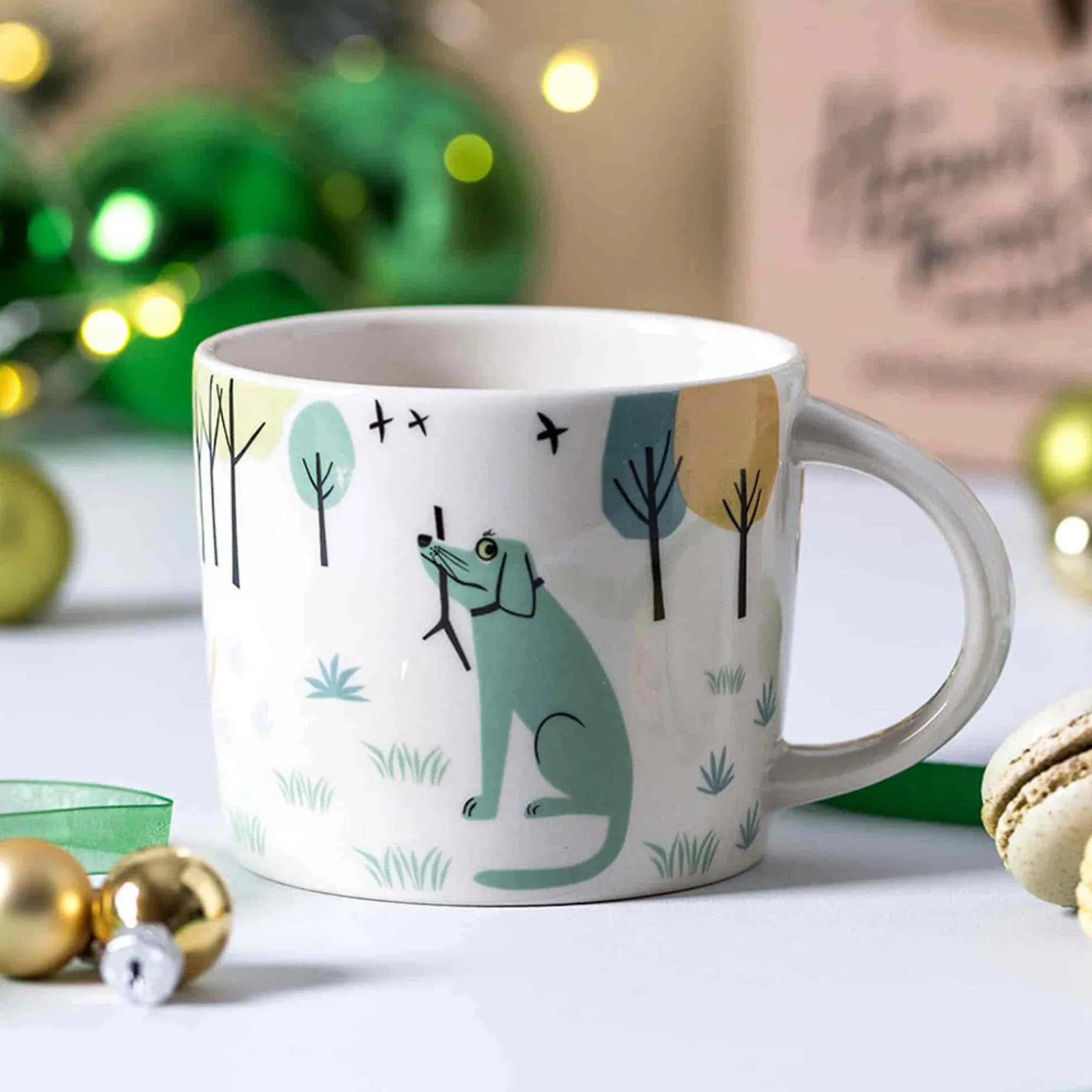 This dog mug is a lovely addition to your breakfast table. The graphic illustrations depict two dogs hunting for sticks in the forest. Muted shades of teal, orange and sage give the mug a calming, cosy look.