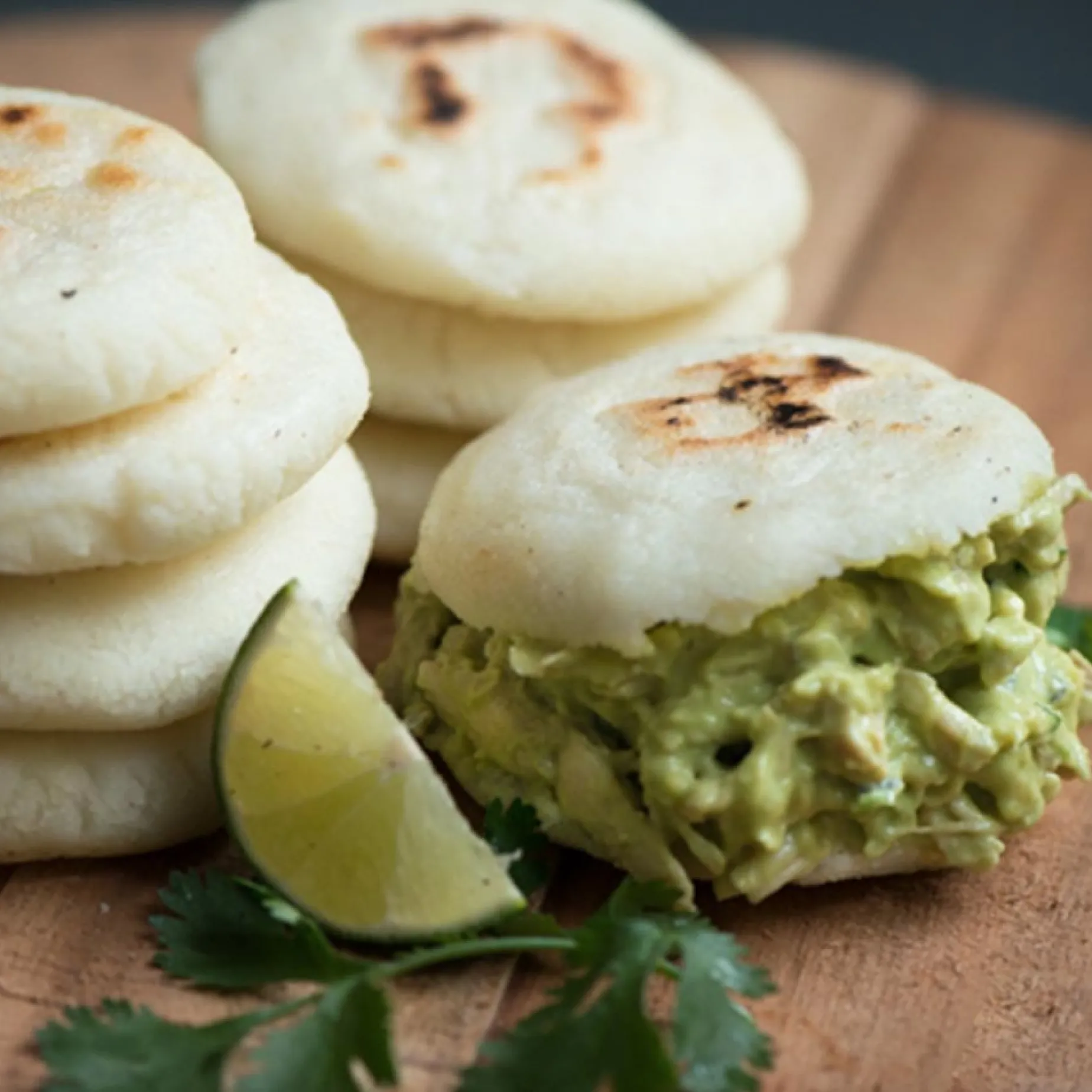An arepa is a grilled cornflour or cornbread ‘bun’, and they’re popularly served as breakfast and street food. Once cooked, they’re split in half to hold fillings. Classic fillings include Reina Pepiada – chicken with avocado, mayonnaise & red onion, shredded beef, cheese, or even just a bit of butter!