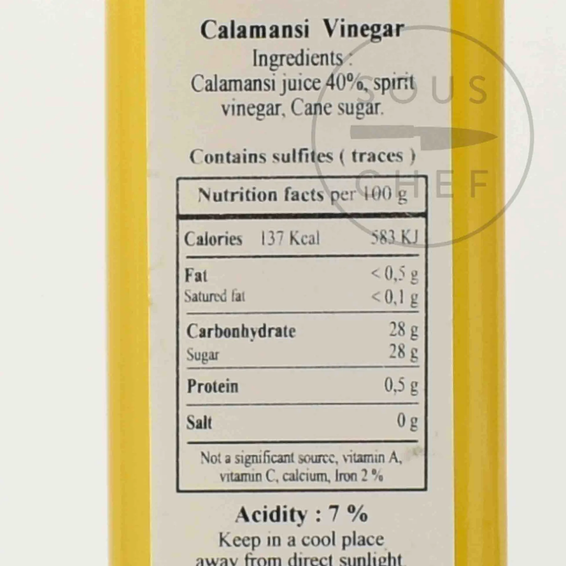 Product formulations and details may change. For the latest ingredients and allergen information always check product packaging prior to consumption. Ingredients: Calamansi juice, vinegar out of spirit, cane sugar. Contains traces of sulphites.