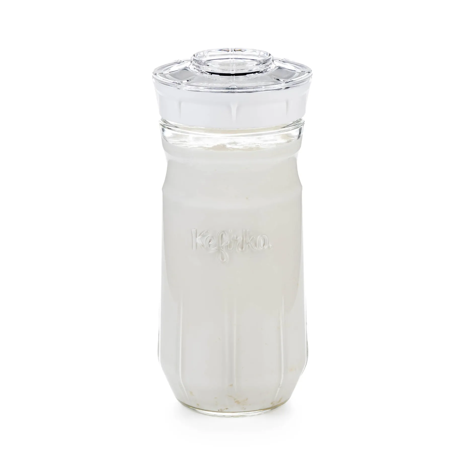 The two-piece lid is designed for optimal airflow during the fermentation process, while also blocking impurities such as dust. A strainer lid features two sizes of slots – one for milk, one for water – so you can sip your kefir thick or thin.