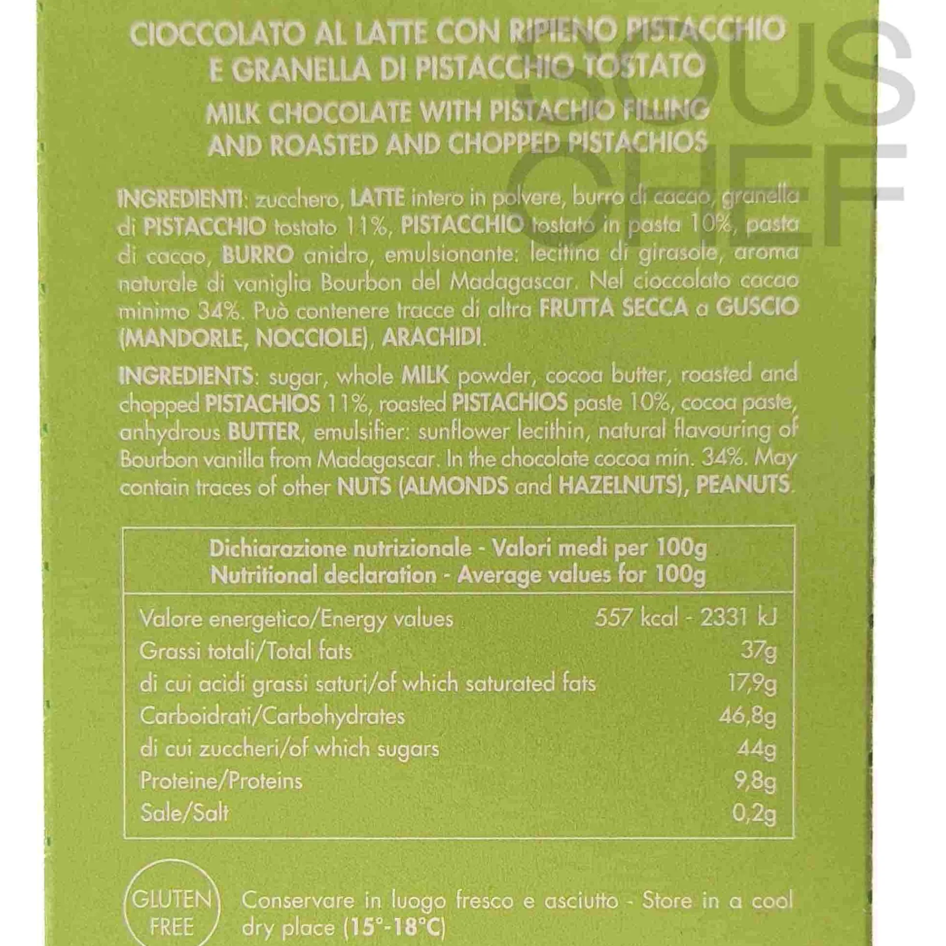 This Italian chocolate bar has a creamy pistachio filling. It melts on the tongue and coats the palate with smooth, sweet milk chocolate.