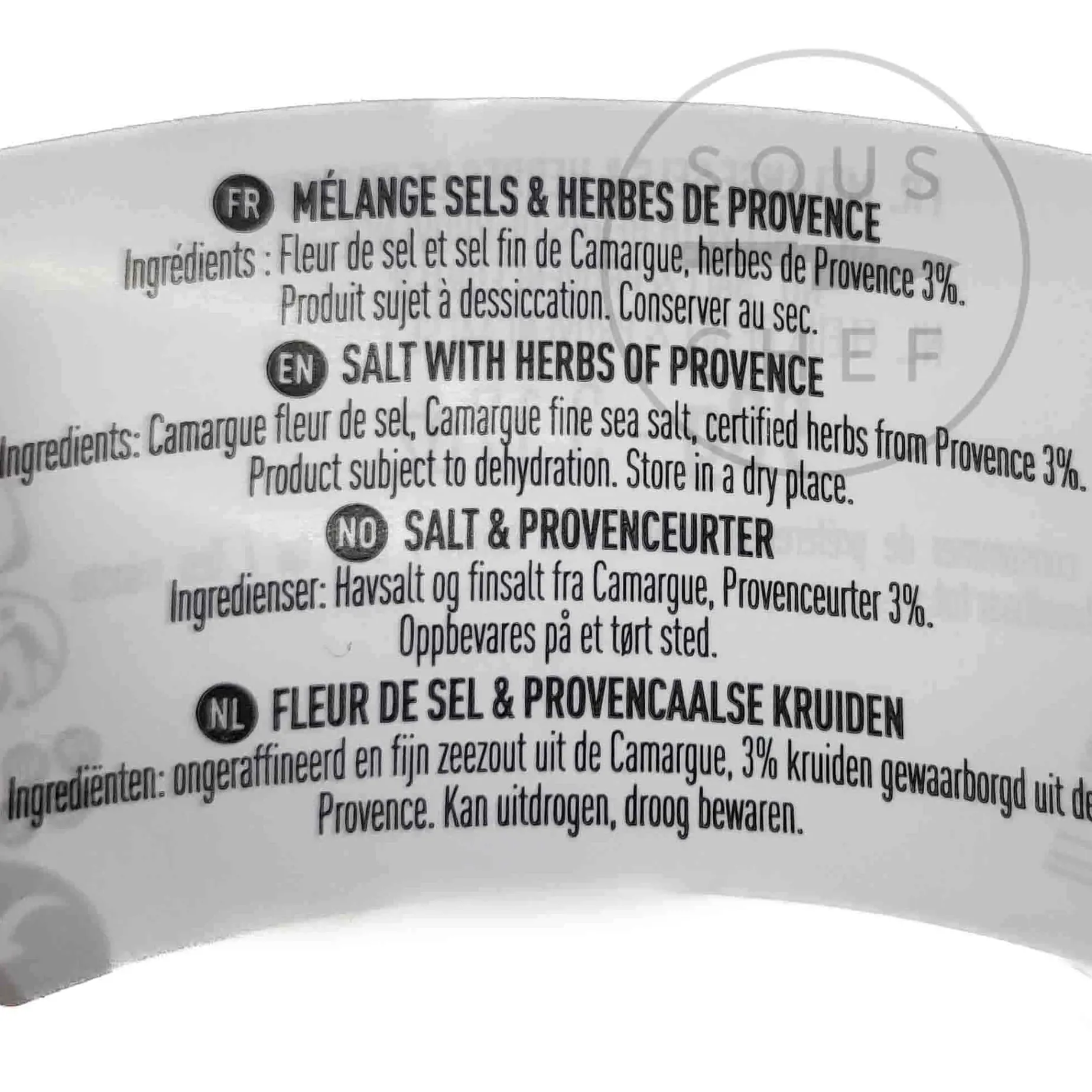 Product formulations and details may change. For the latest ingredients and allergen information always check product packaging prior to consumption. Ingredients: Salt (camargue fleur de fleur, Camargue fine sea salt) (France) 97%, herbs of Provence (France) 3% (rosemary 26%, oregano 26%, savory 26%, thyme 22%)