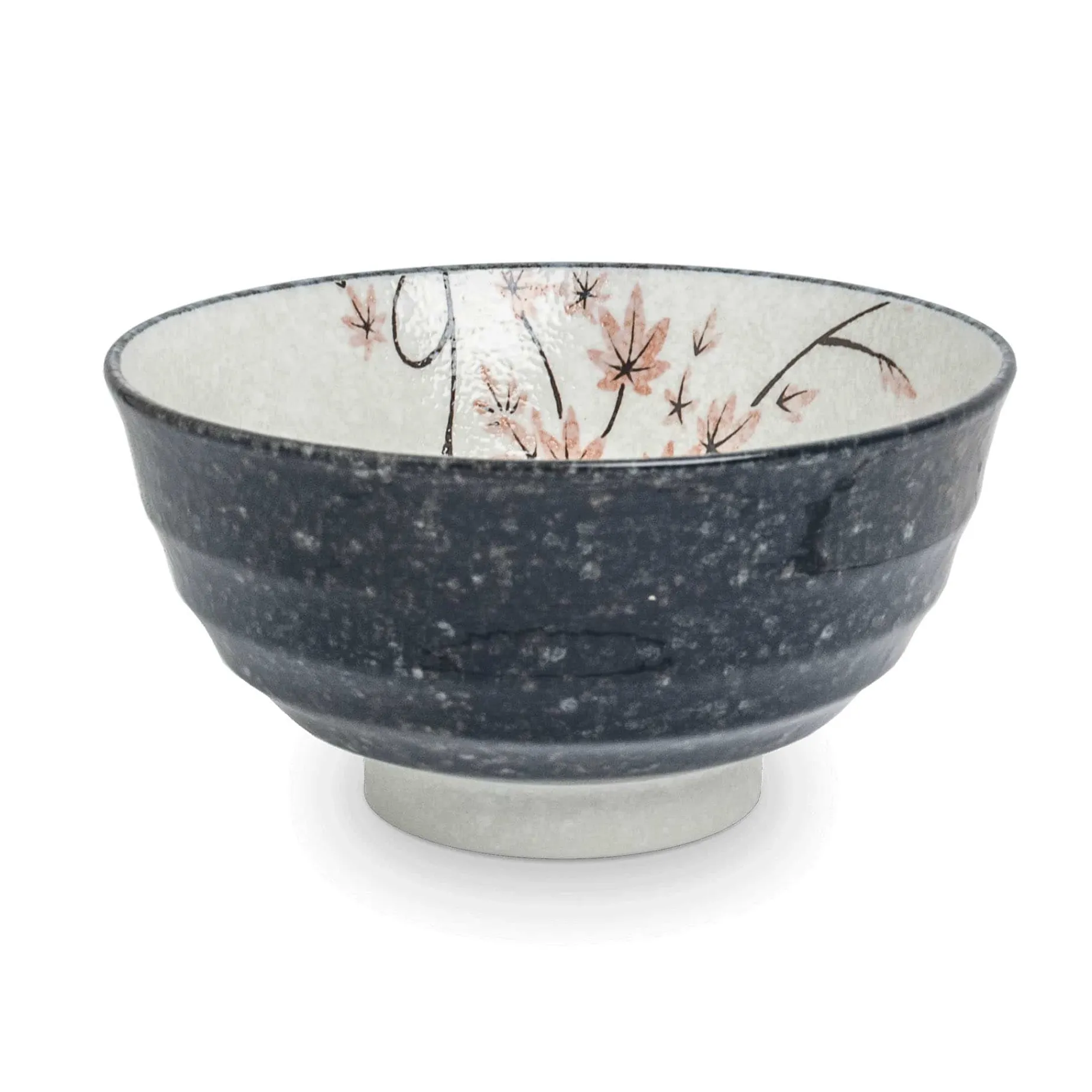 Inspired by nature, this noodle bowl features a dark grey exterior and a delicate maple leaf design. A slender brown tree branch is adorned with pale pink leaves, while a few have blown away as if caught on the breeze. In Japanese culture, the maple tree is considered a symbol of peace and serenity.