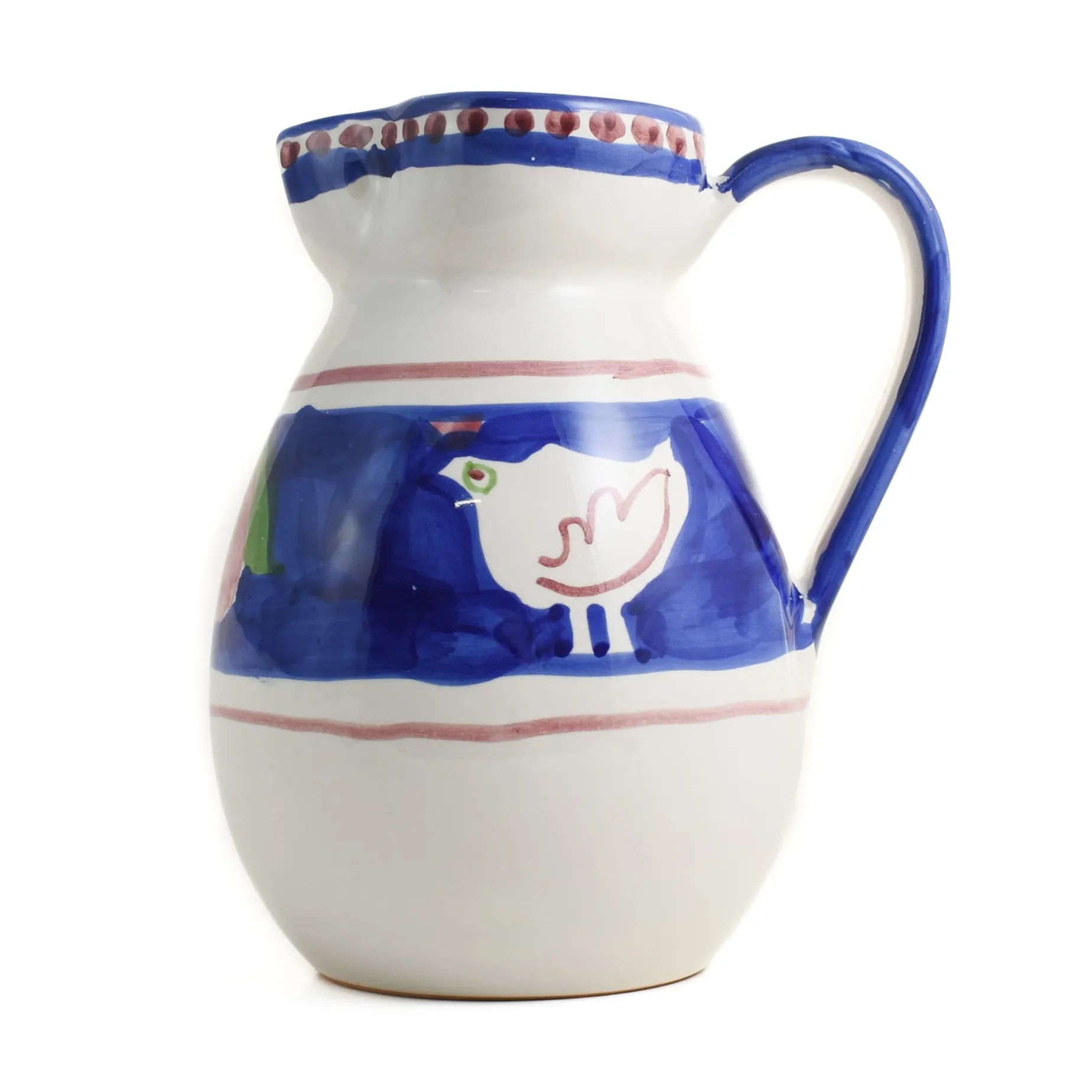 Made in Italy, the pitcher has a rounded body and curved handle. Each one is hand-painted by talented artisans. We love the delicate spotted rim and deep blue stripe around its middle. The pitcher is decorated with white hens and abstract fruit.