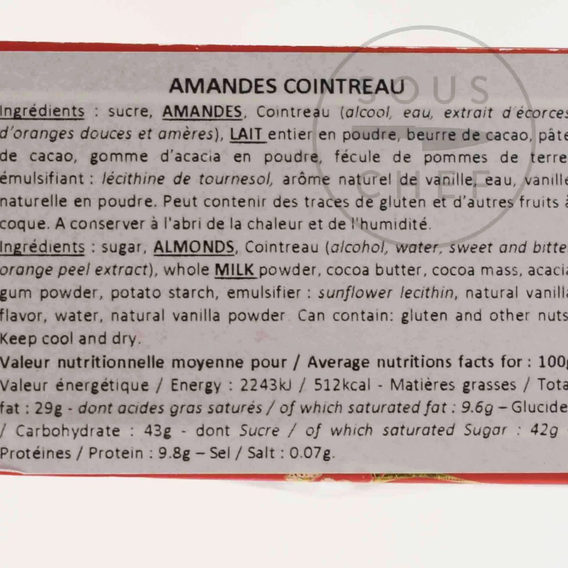Product formulations and details may change. For the latest ingredients and allergen information always check product packaging prior to consumption. Ingredients: Sugar, almond, whole milk, cocoa butter, cointreau, cocoa mass, acacia gum powder, potato starch, emulsifier: sunflower lecithin, natural vanilla flavour, water, natural vanilla powder