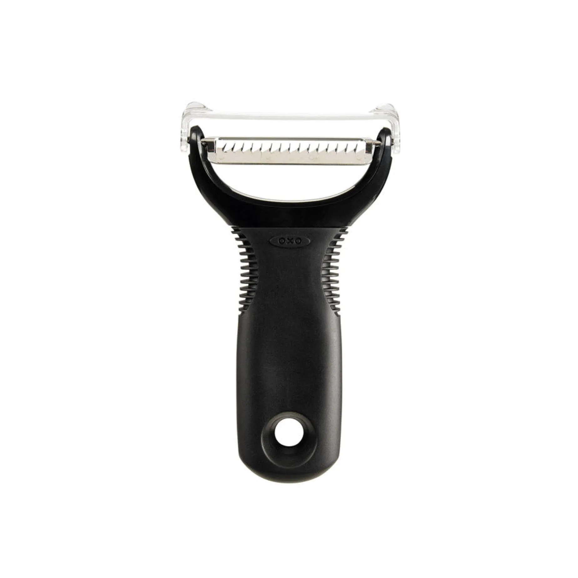 With the OXO Good Grips julienne peeler, stunning vegetable garnishes are just a few strokes away. The super-sharp blades glide through carrots, cucumbers and more to give fine, evenly sized strips.
