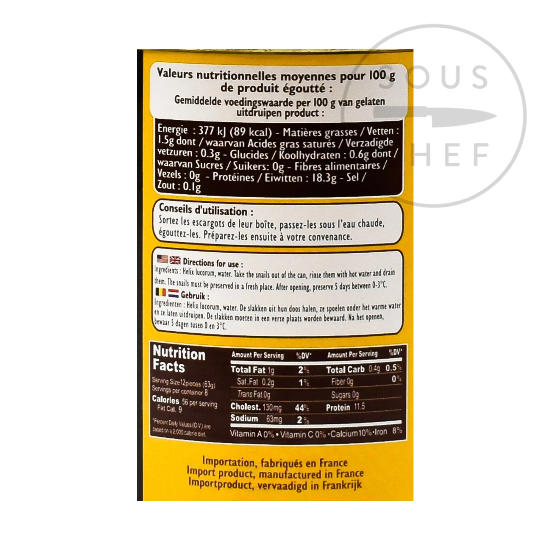 Snails are considered something of a French delicacy – often referred to as ‘escargot’, and frequently cooked with butter, finely-chopped shallots, garlic, parsley, salt and pepper. This extra large tin of French snails is ideal for a dinner party or for caterers.