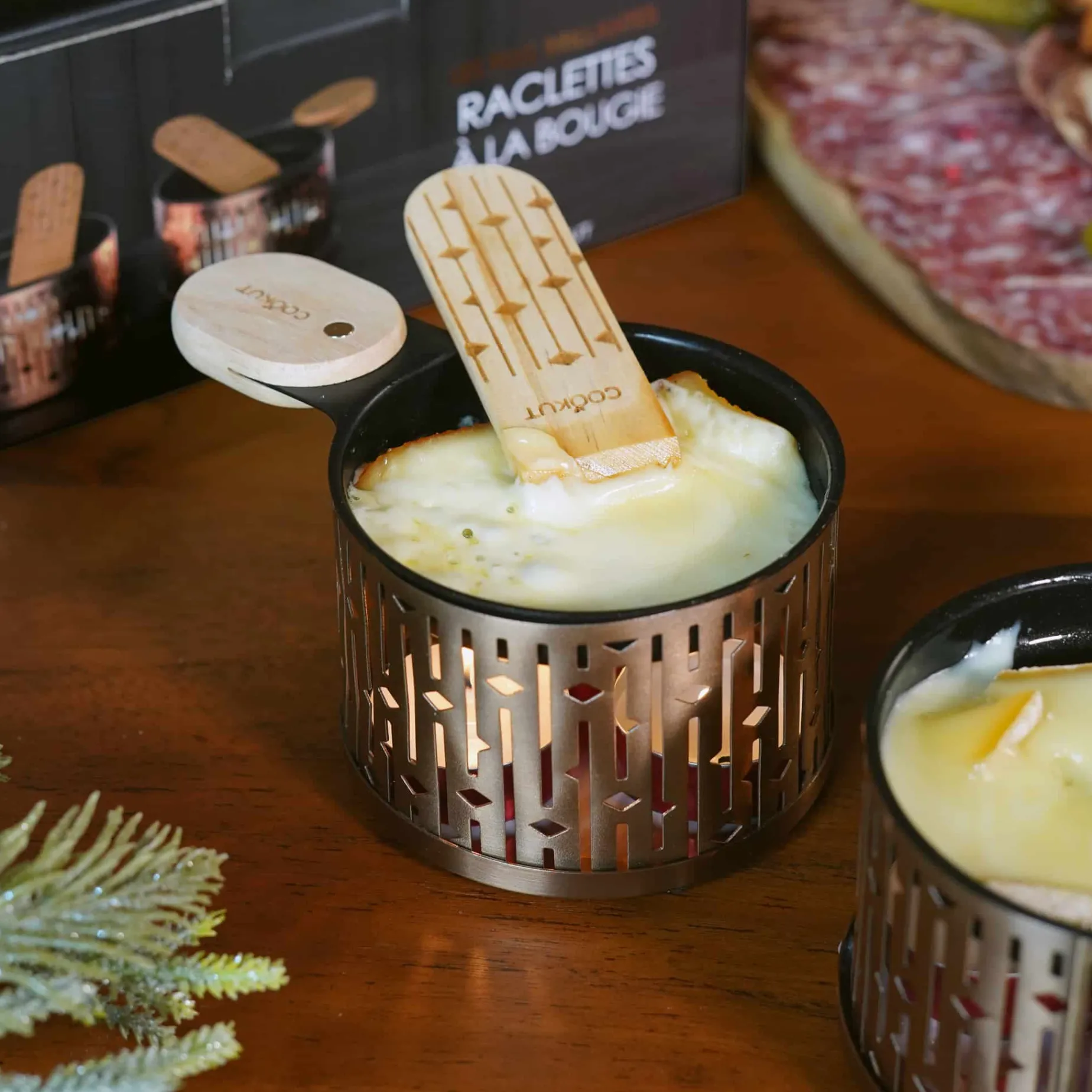 The kit contains two raclette burners and two wooden spatulas. Tealights not included.