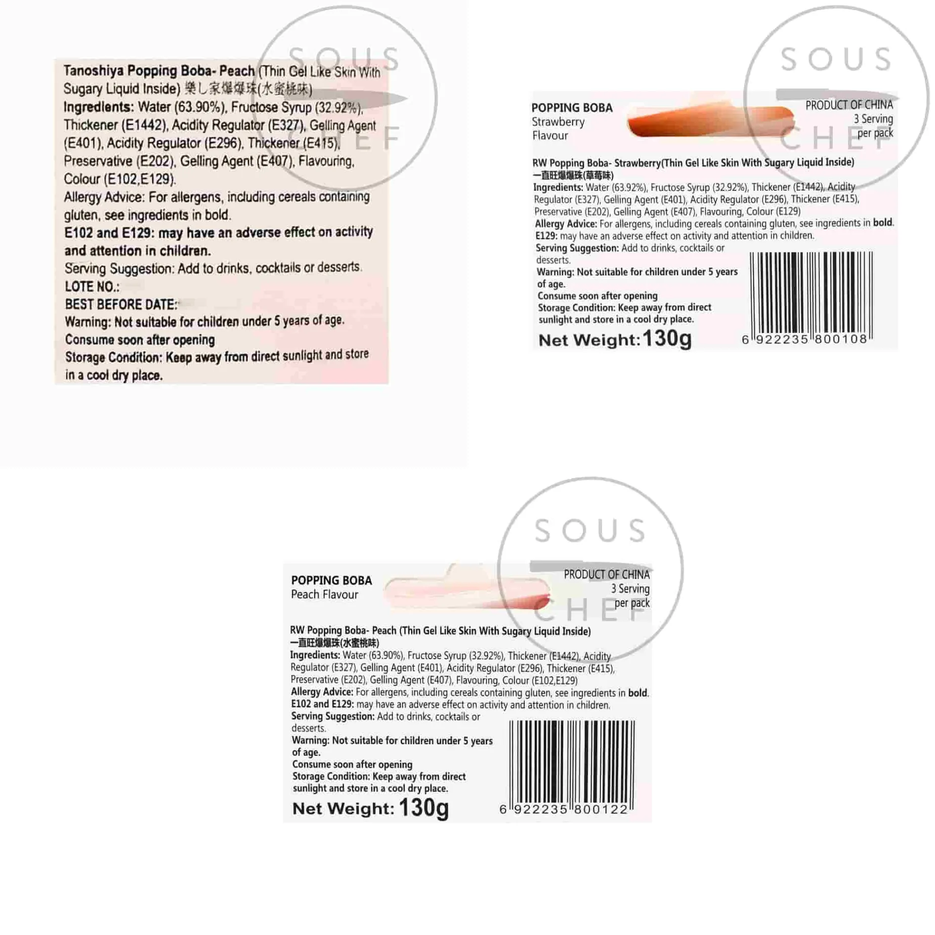 Tanoshiya’s popping boba come in two sizes and the following flavours: