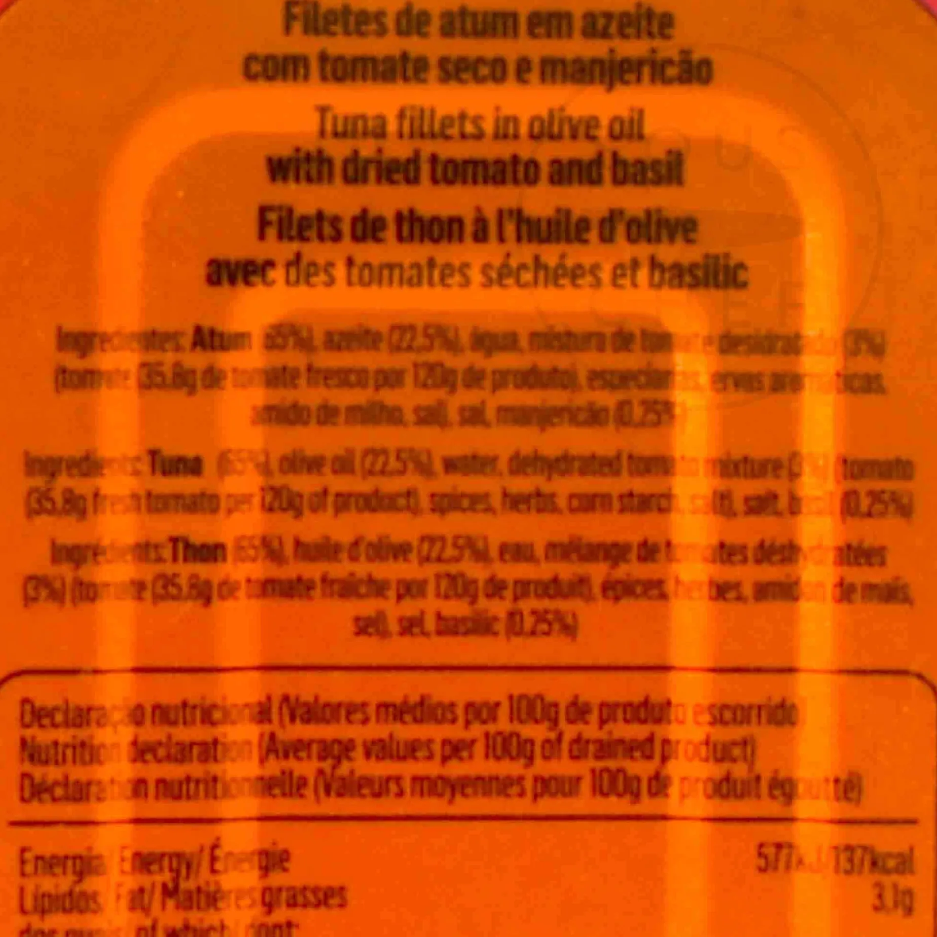 Product formulations and details may change. For the latest ingredients and allergen information always check product packaging prior to consumption. Ingredients: Tuna fish (65%), olive oil (22.5%), water, dehydrated tomato mixture (3%)(tomatoes (35.8g of fresh tomatoes per 120g of product), Spices, Herbs, Cornstarch, Salt), Salt, Basil (0.25%)