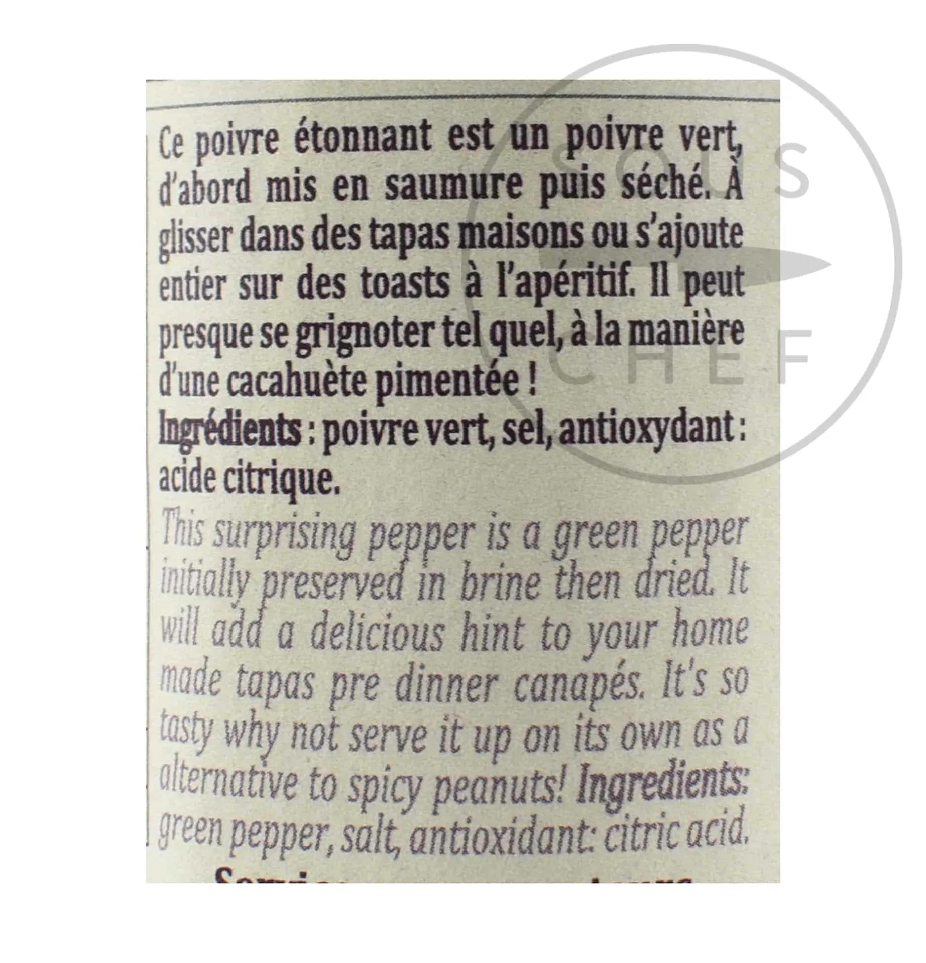 Terre Exotique’s green salty coastal pepper is dried and wonderfully salty – a fantastic snack to eat as you would peanuts. Harvested by hand (while still unripe) on the coasts of Madagascar, these peppercorns are first preserved in brine, then freeze dried, giving them a distinctive crunchy texture.