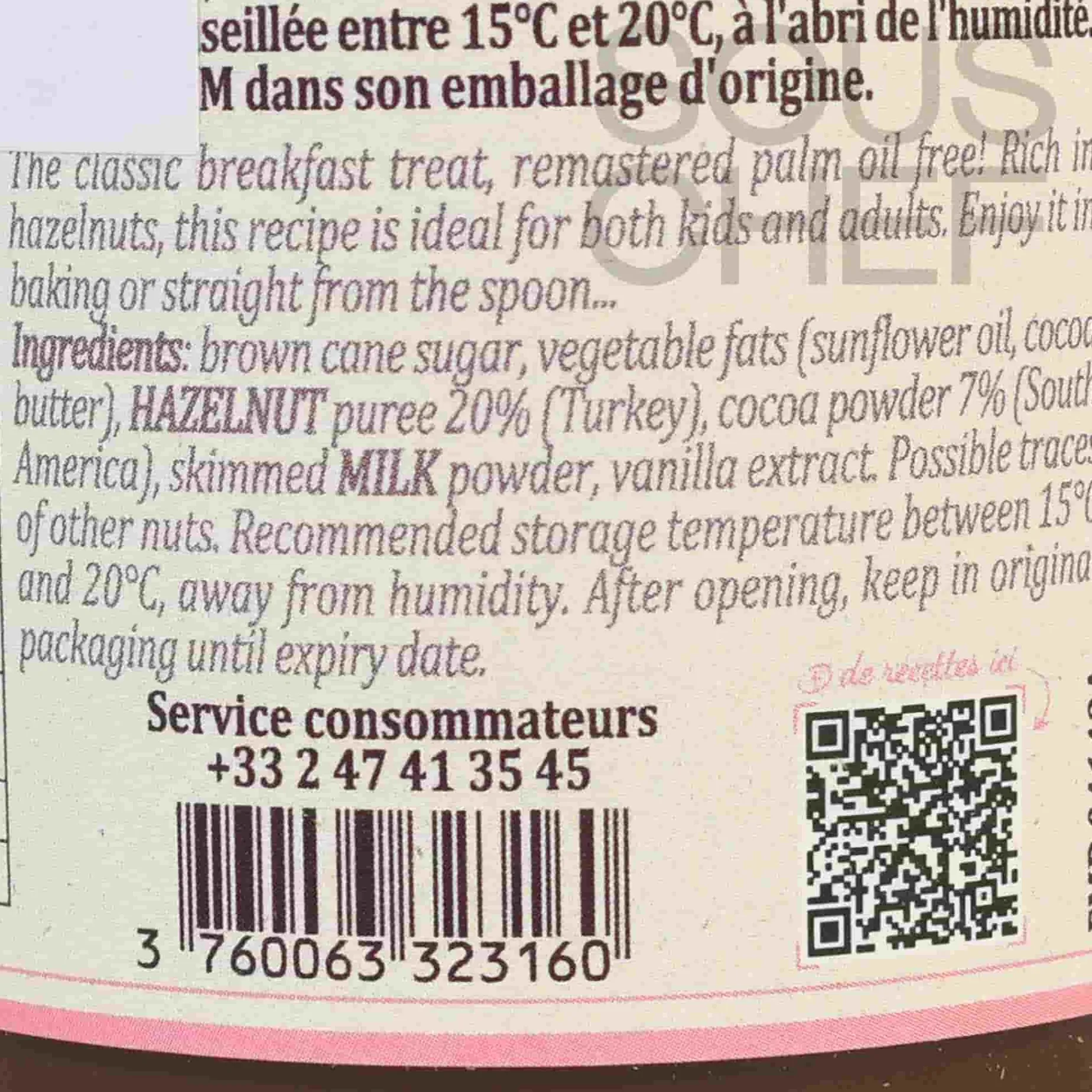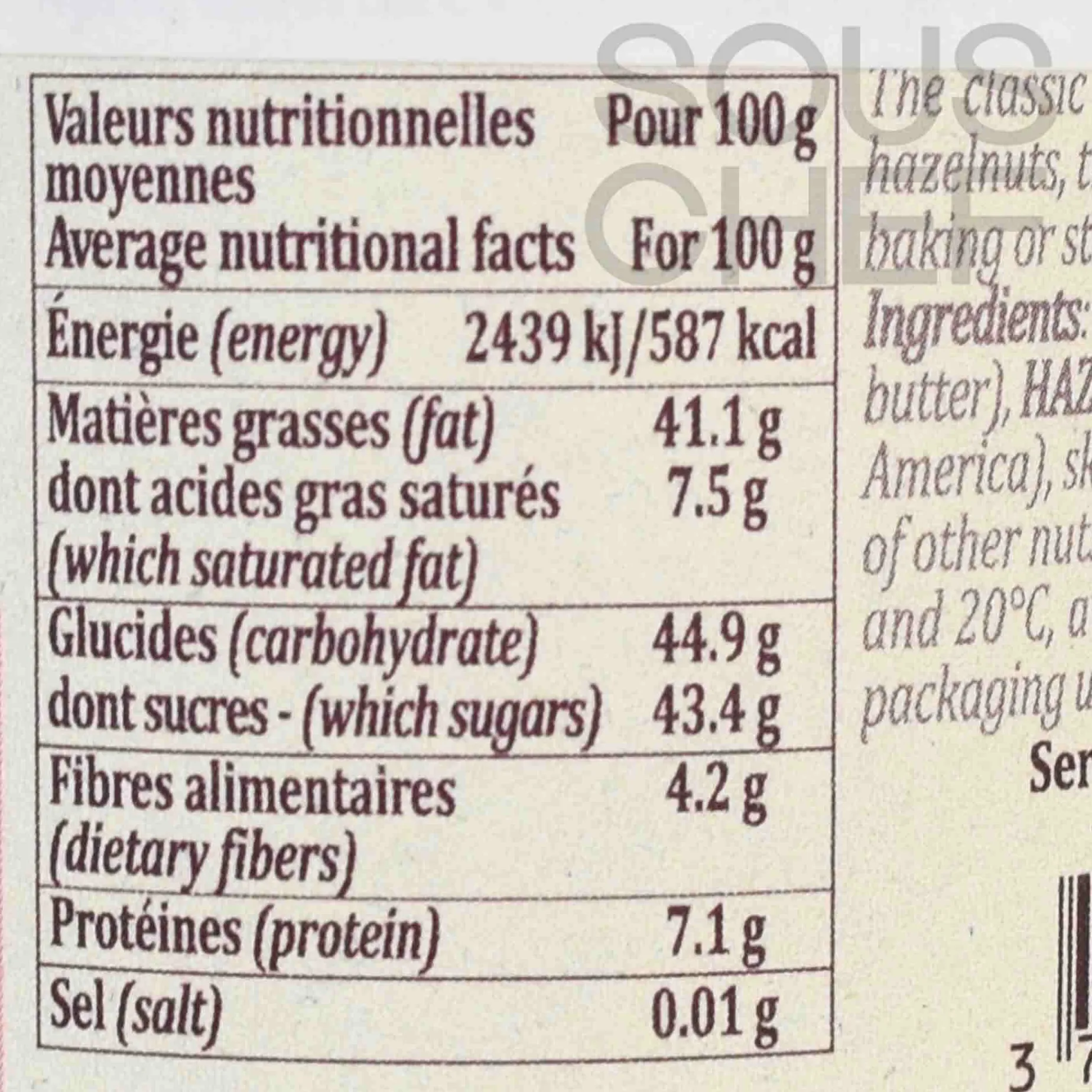 Product formulations and details may change. For the latest ingredients and allergen information always check product packaging prior to consumption. Ingredients: Brown cane sugar, vegetable fats (sunflower oil, cocoa butter), hazelnut puree 20%, cocoa powder 7%, skimmed milk powder, vanilla extract.