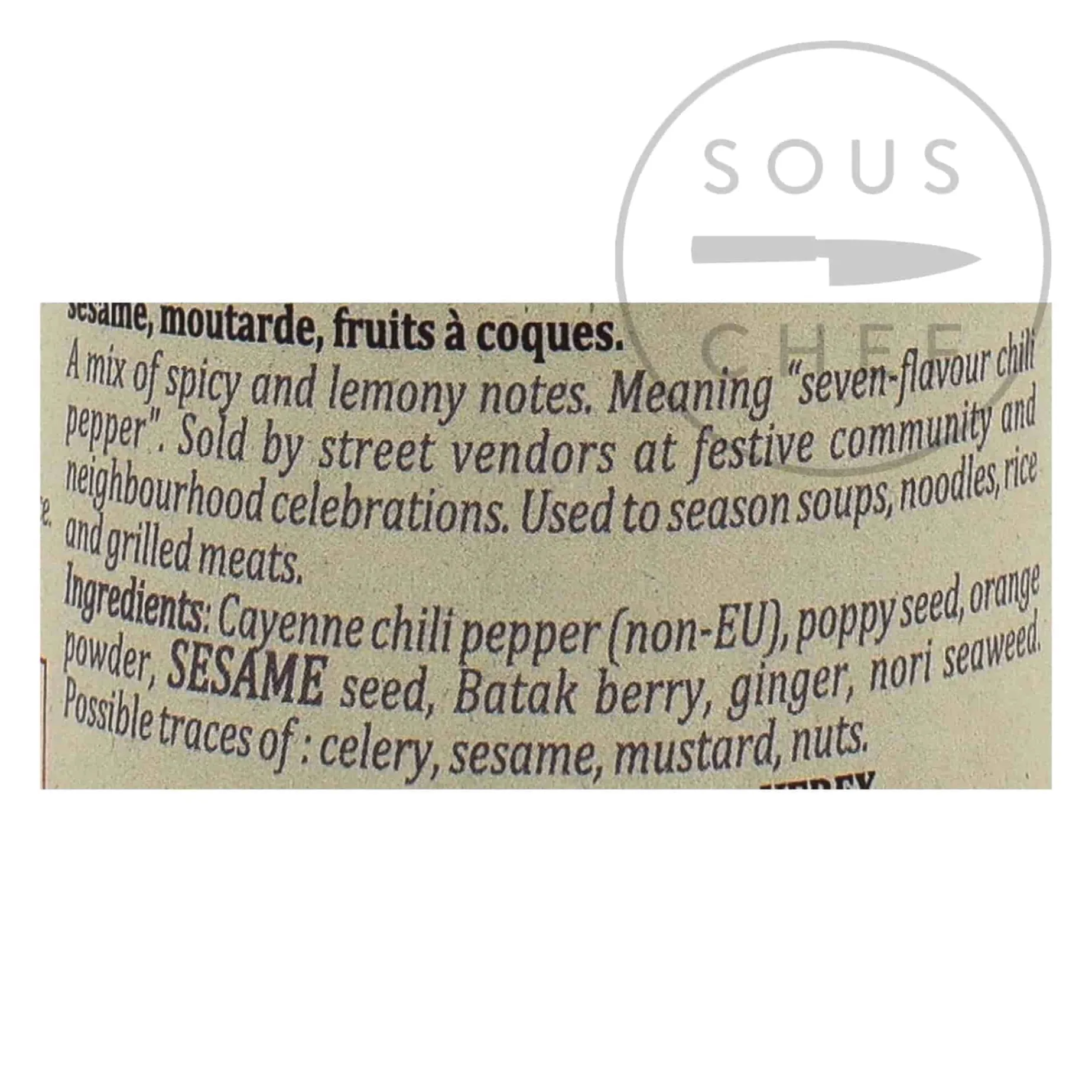 Product formulations and details may change. For the latest ingredients and allergen information always check product packaging prior to consumption. Ingredients: Cayenne chili pepper, poppy seeds, orange powder, sesame seed, Batak berry, ginger, nori seaweed.