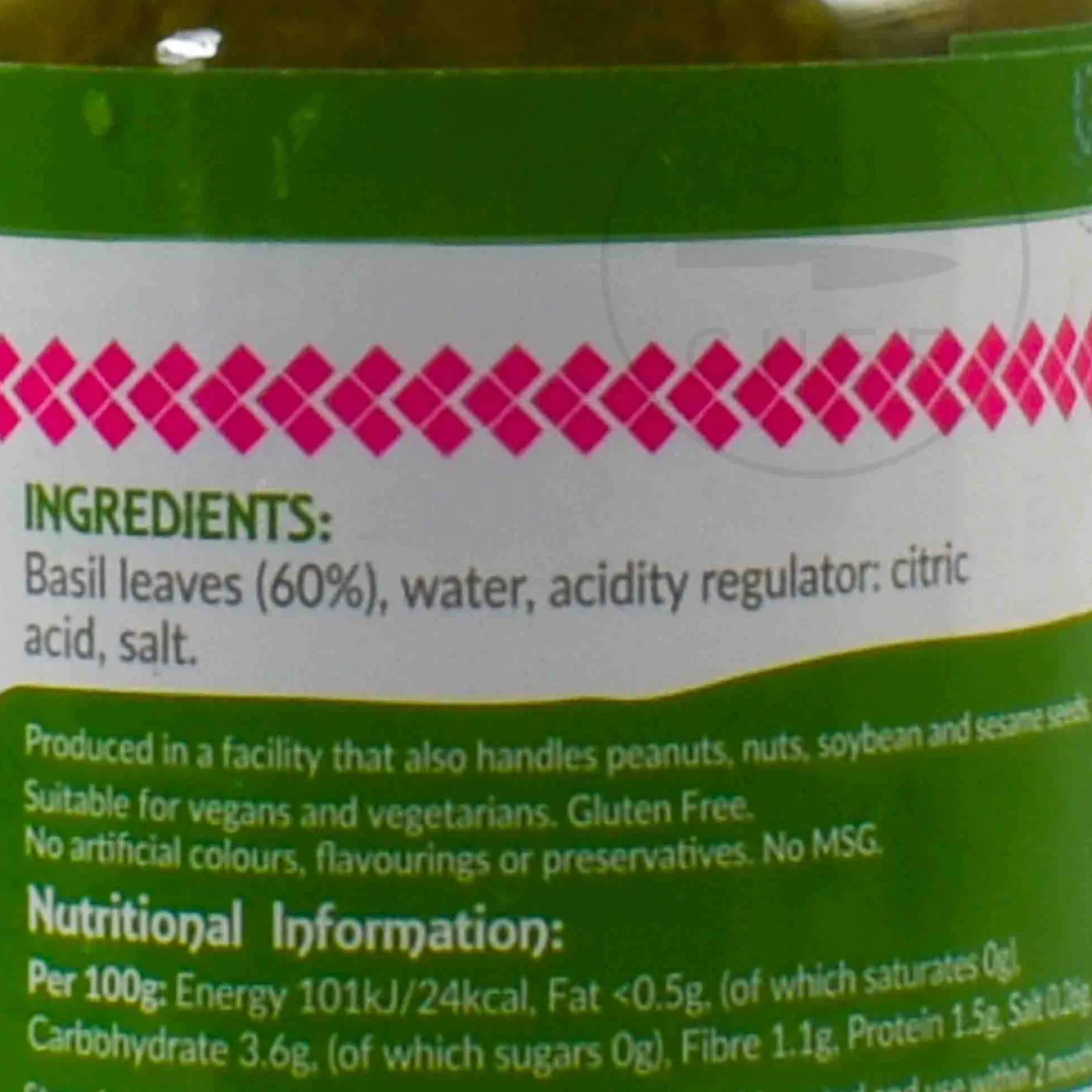 Product formulations and details may change. For the latest ingredients and allergen information always check product packaging prior to consumption. Ingredients: Basil leaves (86.3%), water, acidity regulator: citric acid; salt