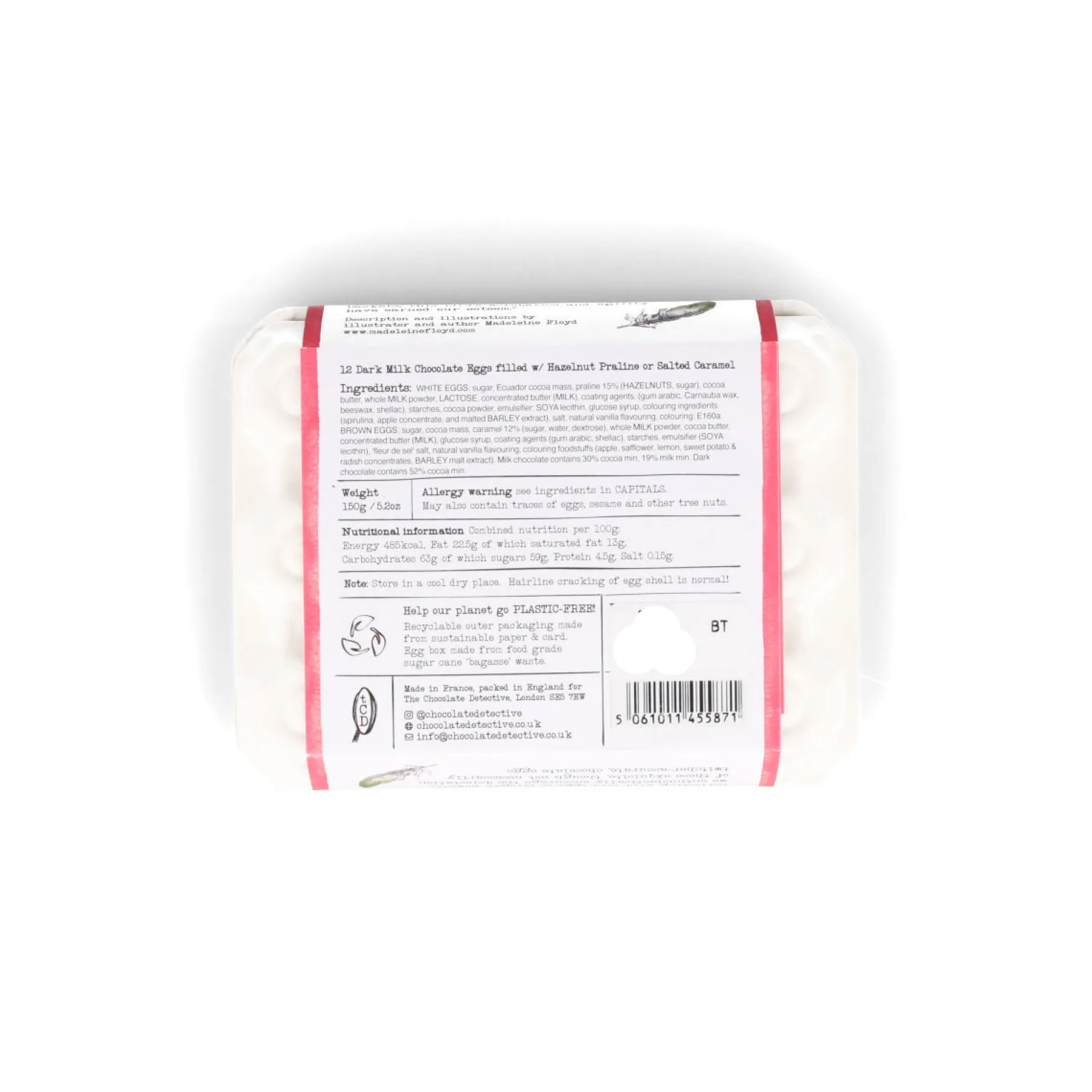 Product formulations and details may change. For the latest ingredients and allergen information always check product packaging prior to consumption. Ingredients: White eggs: sugar, ecuador cocoa mass, praline 15% (hazelnuts, sugar), cocoa butter, whole milk powder, lactose, concentrated butter (milk), coating agents, (gum arabic, carnauba wax, beeswax, shellac), starches, cocoa powder, emulsifier: soya lecithin, glucose syrup, colouring ingredients (spirulina, apple concentrate, and malted barley extract), salt, natural vanilla flavouring, colouring: e160a. brown or blue eggs: sugar, cocoa mass, caramel 12% (sugar, water, dextrose), whole milk powder, cocoa butter, concentrated butter (milk), glucose syrup, coating agents (gum arabic, carnauba wax, beeswax, shellac), starches, emulsifier: soya lecithin, colouring foodstuffs (spirulina, apple, safflower, lemon, sweet potato & radish concentrates, barley malt extract), “fleur de sel” salt, natural vanilla flavouring. milk chocolate contains 30% cocoa min, 19% milk min. dark chocolate contains 52% cocoa.