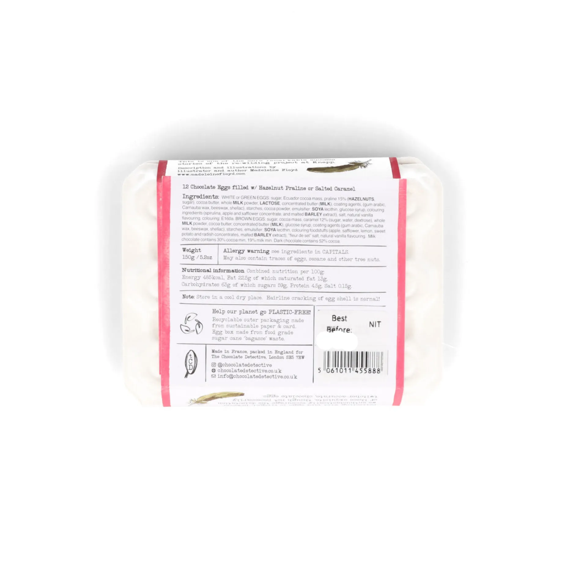 Six eggs are filled with smooth salted caramel. The rest are filled with a rich hazelnut praline.